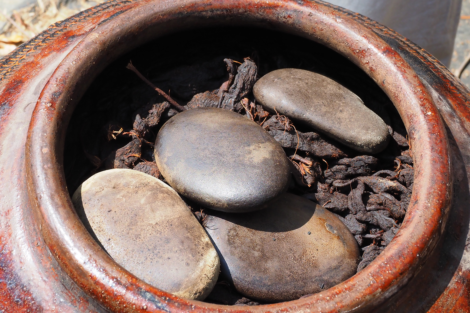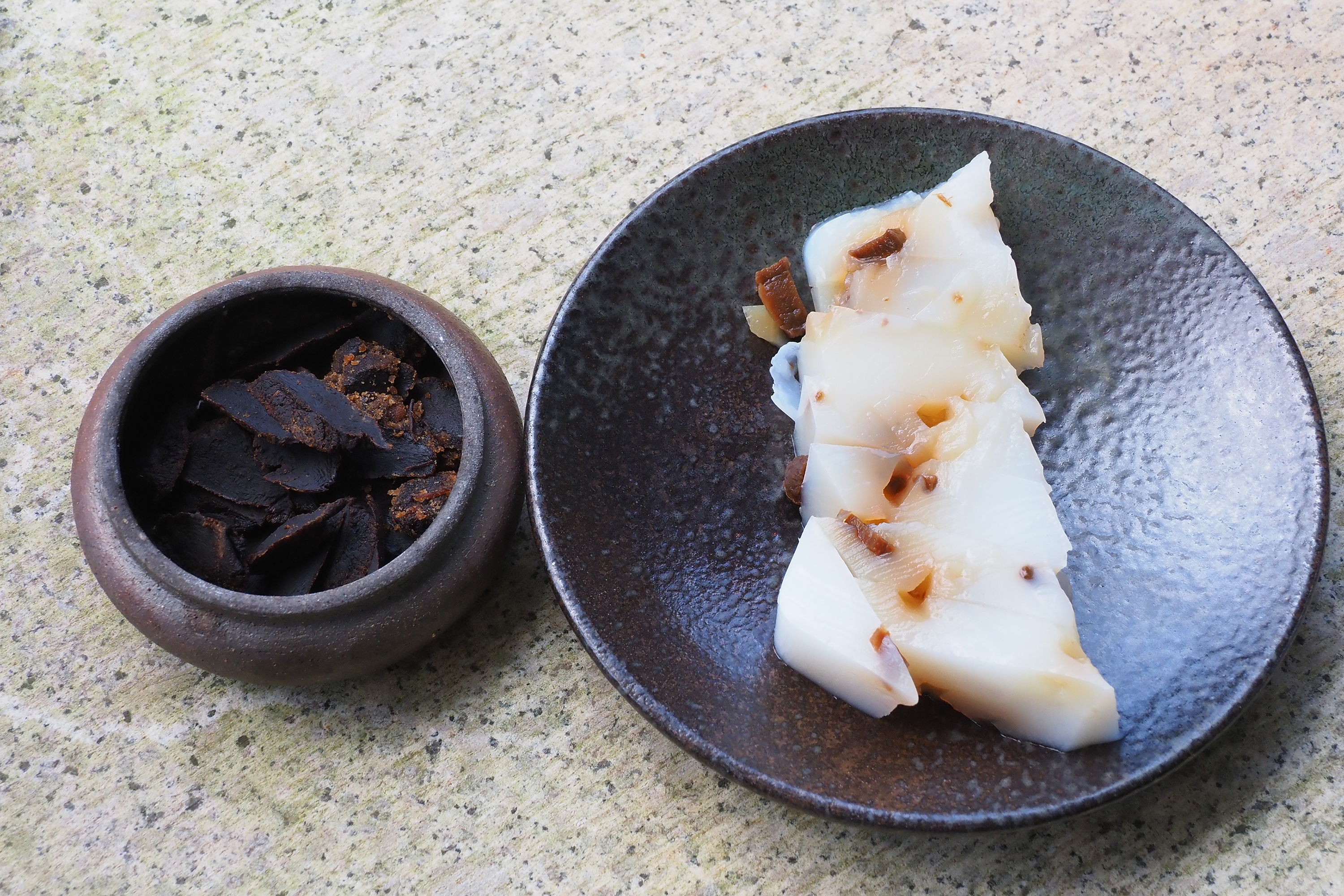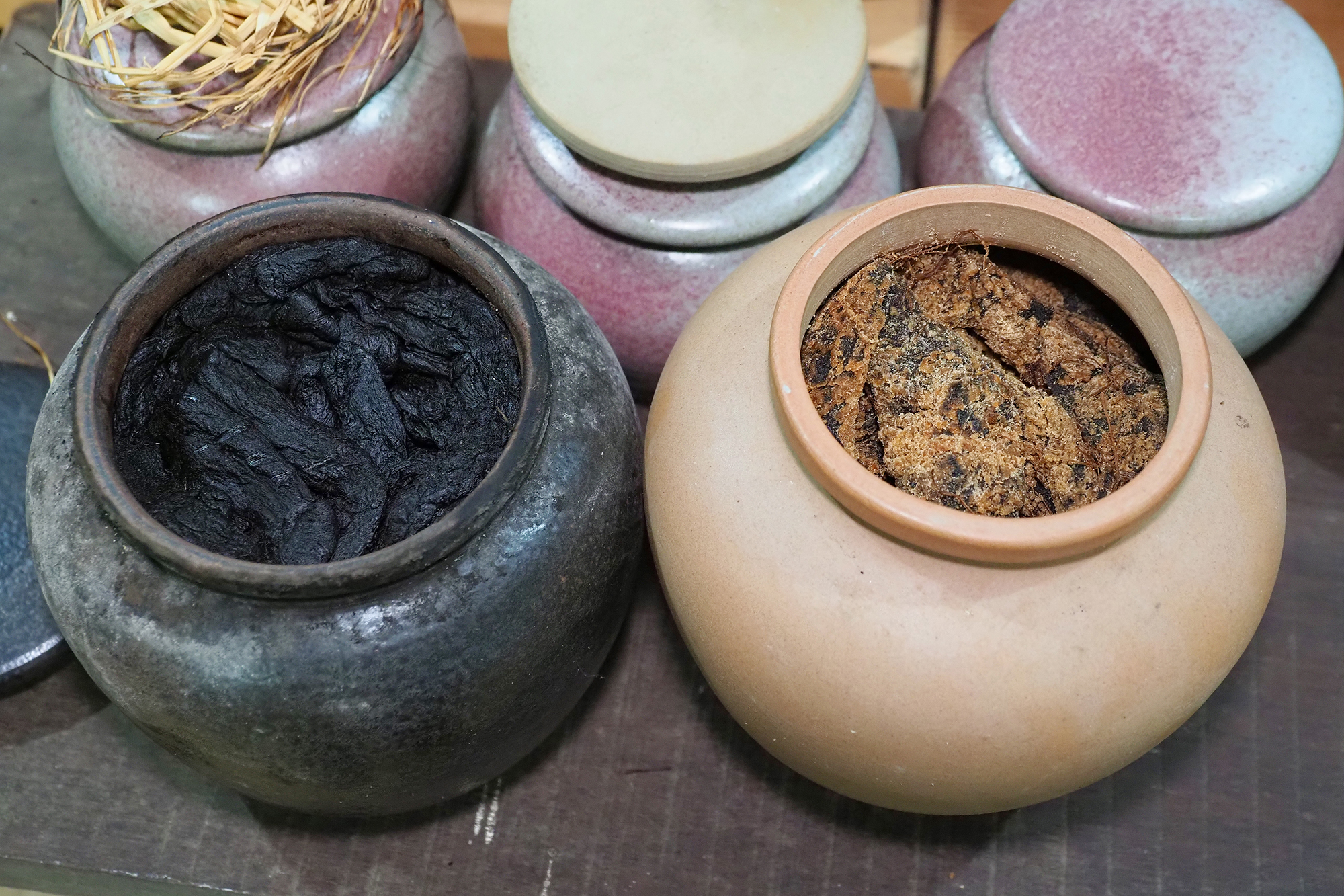 เหล่าไชโป้วหรือไชโป้วเก่า ที่ฟาร์มเฉินเจี๋ยเก็บไว้เป็นเวลากว่าสิบปี ไชโป้วดำเป็นประกายมันวาว เนื้อนุ่ม มีรสหวานเค็มคล้ายผลไม้หมักดอง ส่วนโถด้านขวาเป็นไชโป้วที่มีอายุเก็บรักษาน้อยกว่า จะเห็นผลึกเกลือที่บริเวณพื้นผิวของไชโป้ว