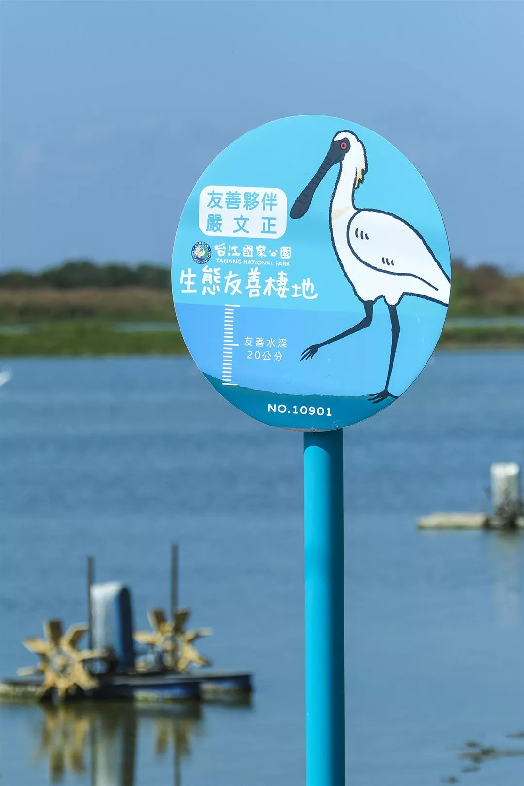 เมื่อเรามาถึงบ่อปลาอีกแห่ง กัวตงฮุยชี้ไปที่ป้ายข้างสระน้ำให้เราดู เป็นมาตรการ “การสร้างระบบนิเวศเป็นมิตรสำหรับที่อยู่ของสัตว์” เป็นสิ่งที่อุทยานแห่งชาติไถเจียงผลักดันส่งเสริมให้ชาวประมงหลังจับปลาในบ่อไปแล้ว ให้รักษาระดับ น้ำลึกไว้ที่ 20 เซนติเมตร และเหลือปลาตัวเล็กไว้เป็นอาหารสำหรับนกปากช้อนหน้าดำ