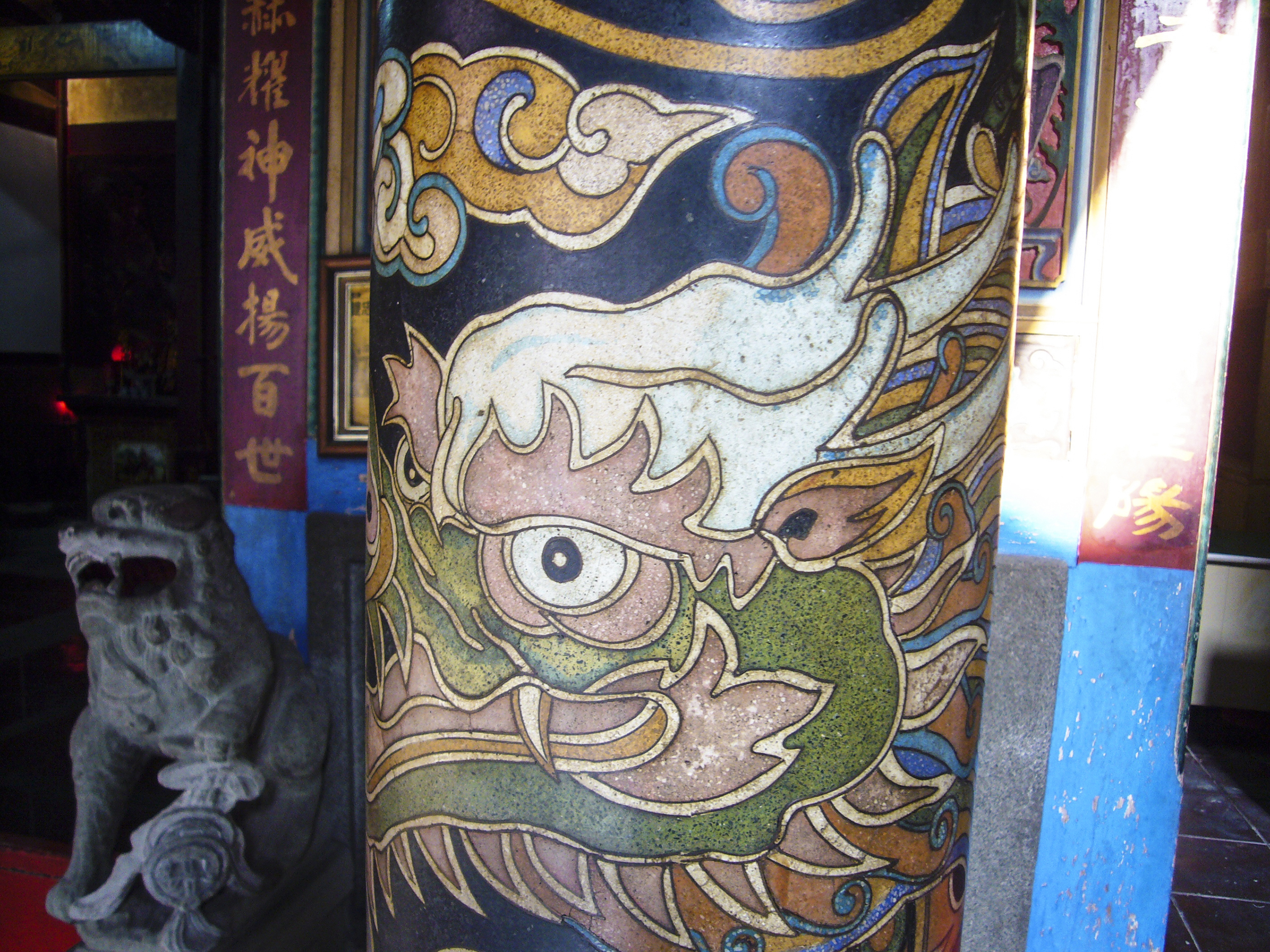 เสามังกรในวัดไต้หวันส่วนใหญ่เป็นงานแกะสลักหิน แต่เสามังกร ในศาลเจ้าซวงจง เป็นงานหินขัดที่พบเห็นได้ยาก ลวดลายที่ละเอียดอ่อนและงดงามของแปดเซียน และมังกร น่าทึ่งมาก (ภาพจาก : เย่จวิ้นหลิน)