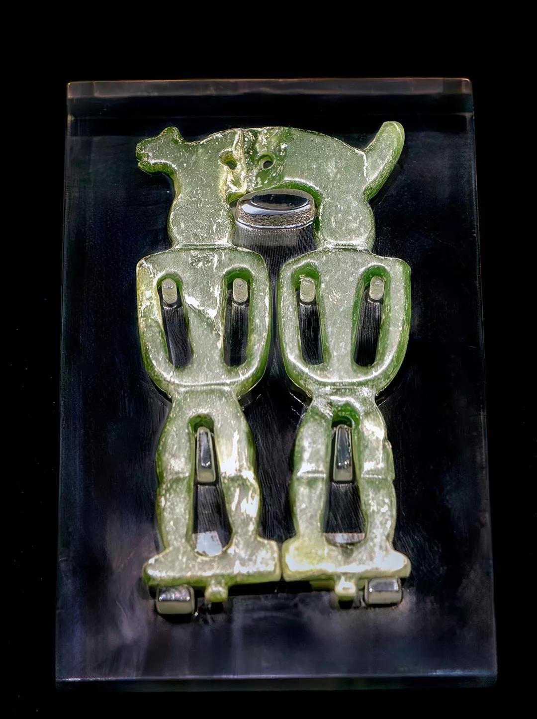 วัฒนธรรมเปยหนานค้นพบเครื่องประดับหยกจำนวนมาก แสดงถึงจุดรุ่งเรืองที่สุดของงานแกะสลักเครื่องหยกในยุคนั้น ภาพนี้คือ หยกรูปมนุษย์และสัตว์ ถือเป็นสมบัติประจำชาติ