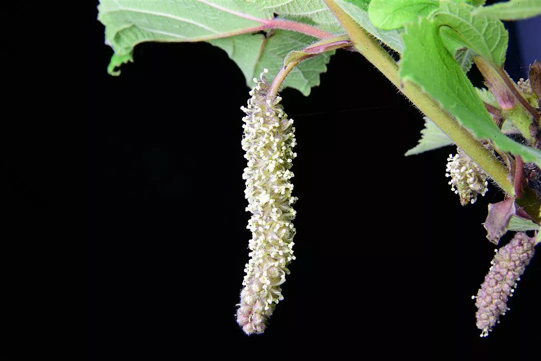 (ล่าง) ต้นปอสาในหมู่เกาะแปซิฟิกเกือบทั้งหมดเป็นต้นตัวเมีย จึงแทบไม่พบช่อดอกตัวผู้ ที่มีลักษณะคล้ายตัวหนอนเลย (ภาพจาก จงกั๋วฟาง)