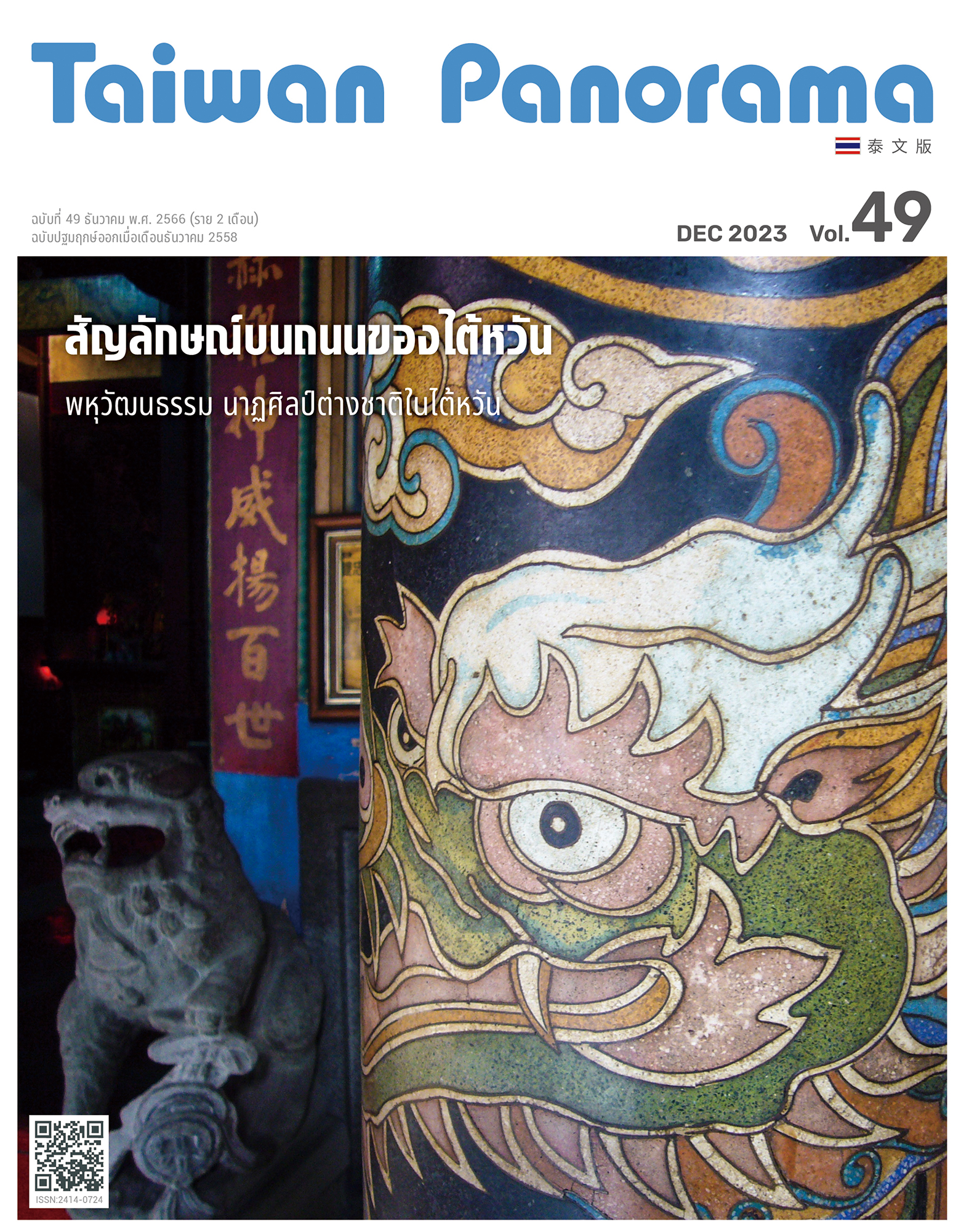นิตยสาร “ไต้หวันพาโนรามา” ภาษาอาเซียนฉบับที่ 49 (เดือนธันวาคม พ.ศ. 2566) รายงานในหัวข้อหลัก “สัญลักษณ์บนท้องถนนของไต้หวัน” แบ่งออกเป็น 4 บทความคือ ทิวทัศน์ที่ซ่อนอยู่ในตรอกซอกซอย ขอคารวะต่อความมีอิสรเสรีของเหล่าเหล็กดัดหน้าต่าง, เสียงจอแจของฝูงชน ภูมิทัศน์ป้ายร้านค้าสไตล์ไต้หวัน, หินขัด งานก่อสร้างธรรมดาและไม่ธรรมดา รังสรรค์สถาปัตยกรรมด้วยเศษหินและปูนซีเมนต์ และกระเบื้องแผ่นเล็กกับประวัติอันยิ่งใหญ่ ไปฟังสถาปนิกญี่ปุ่นเล่าเรื่องกระเบื้องเคลือบในไต้หวัน จากการเปลี่ยนแปลงของวัสดุก่อสร้างที่มีความแตกต่างกัน 4 ประเภท ได้แก่ เหล็กดัดหน้าต่าง ป้ายร้านค้า หินขัด และแผ่นกระเบื้อง แสดงให้เห็นถึงภาพบรรยากาศของท้องถนนไต้หวันในยุคสมัยต่าง ๆ กับร่องรอยเบาะแสทางวัฒนธรรม