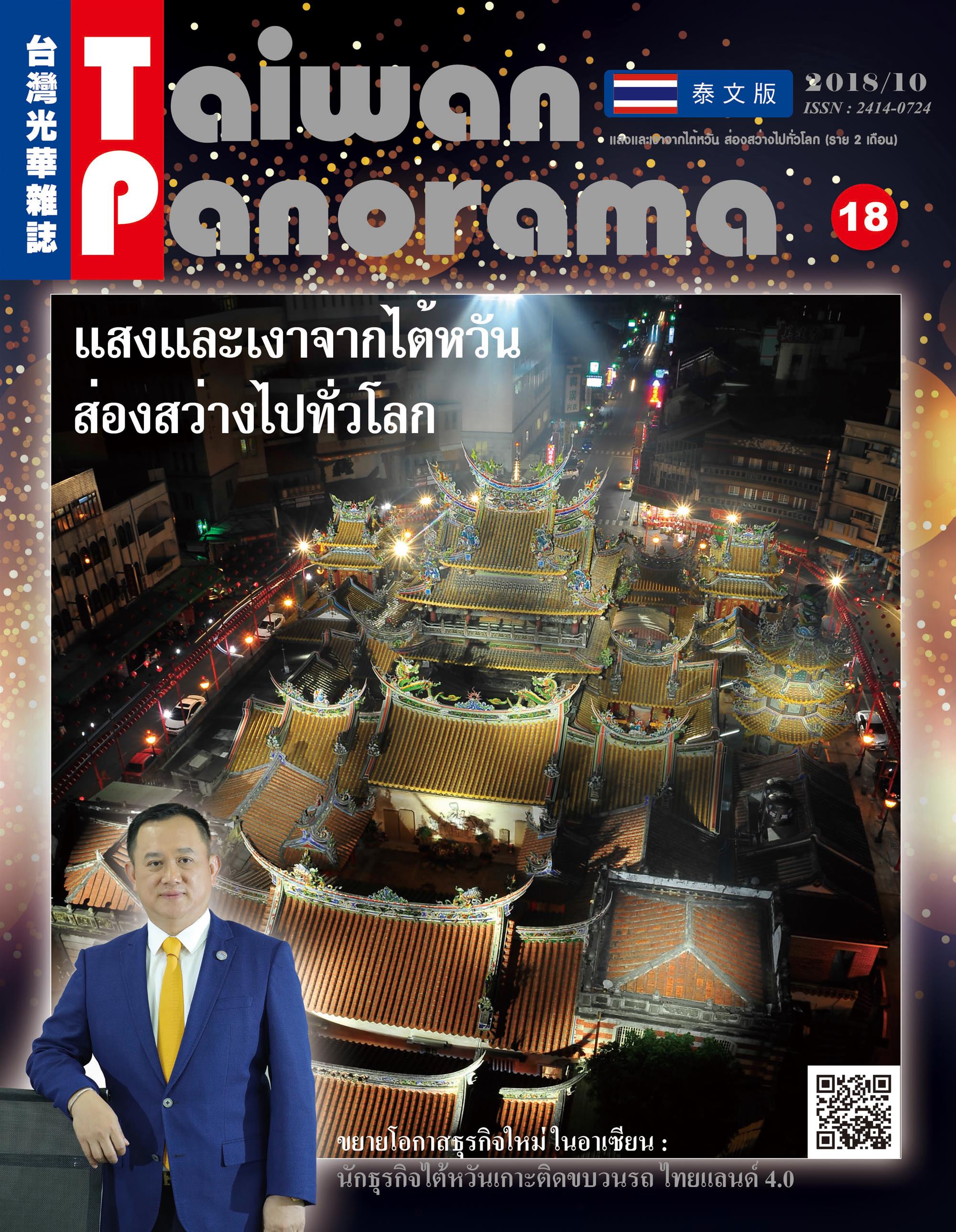 ไต้หวันพาโนรามาภาษาเอเชียตะวันออกเฉียงใต้ ฉบับที่ 18 (ประจำเดือนตุลาคม ปีค.ศ.2018) จะขอนำเสนอเรื่องราวภายใต้หัวข้อ แสงและเงาจากไต้หวัน ส่องสว่างไปทั่วโลก โดยมีบทความหลัก 4 เรื่อง ประกอบด้วย "ส่องสว่างไต้หวัน : โจวเลี่ยนเล่นกับแสง (ไฟ) ด้วยหัวใจศิลปิน", "แสงแห่งนครา สาดส่องไปทั่วหล้า""นักสู้ผู้ไม่ยอมแพ้ : เหยียนหรงจงศิลปินนักล่าฝัน" และ "ทำซ้ำ กลไก แห่งความทรงจำ : ผลงานแนวทดลองของการถ่ายภาพแบบหลี่เฮ่า" ซึ่งเป็นการบอกเล่าเรื่องราวเชิงลึกของไต้หวันด้านการออกแบบแสงสว่างในระดับนานาชาติ เทคนิคการใช้แสงบนภาพวาดสีน้ำมัน รวมถึงการนำแสงและเงามาทับซ้อนกันจนกลายเป็นภาพถ่ายศิลปะที่มีเอกลักษณ์โดดเด่น เป็นต้น