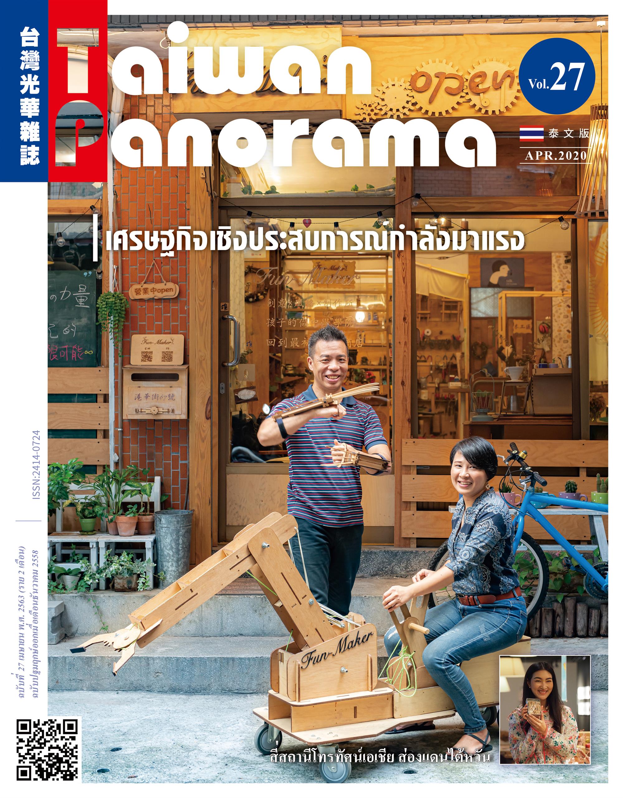“ไต้หวันพาโนรามา” ภาษาอาเซียน ฉบับที่ 27 (ประจำเดือนเมษายน 2563) ฉบับนี้ นำเสนอภายใต้คอนเซ็ปต์ “เศรษฐกิจเชิงประสบการณ์กำลังมาแรง” มี 4 บทความ ได้แก่ “พืชน้ำกับแผ่นโลหะ สัมผัสประสบการณ์ใหม่ เพื่อเดินต่อไปให้ไกลขึ้น!” “หนังสือนำเที่ยวที่เล่าขานตำนานเรื่องราว ศึกษาปัญหาในท้องถิ่นไต้หวันผ่านเกมการละเล่น” “ย้อนอดีตความสุขในวัยเด็ก สุขสมรื่นรมย์กับการลงมือทำด้วยตนเอง” และ “คนช่างฝันผู้เดินเข้าออกโลกเสมือนกับโลกจริงดังใจนึก โลกแห่งความบันเทิงอันดื่มด่ำของสวีเจียข่าย” จากมุมมอง “การยกระดับโรงงานแบบดั้งเดิมเป็นโรงงานเชิงท่องเที่ยว” “การท่องเที่ยวเมืองเล็กในเชิงลึก” “แนวโน้มเวิร์กชอปงานหัตถกรรม” และ “จากเศรษฐกิจเชิงประสบการณ์ต่อยอดเป็นธุรกิจสตาร์ทอัพ” ทั้ง 4 ด้าน แนะนำผู้ประกอบการไต้หวันสร้างสรรค์เศรษฐกิจจากการสัมผัสประสบการณ์แปลกใหม่ได้อย่างไร