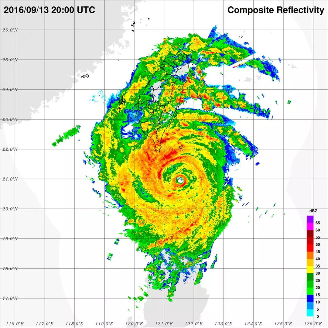 รวบรวมข้อมูลเรดาร์จากไต้หวันและฟิลิปปินส์ ก่อนจะวาดออกมาเป็นภาพการเคลื่อนตัวของพายุไต้ฝุ่น “มรกต” ซึ่งเป็นพายุไต้ฝุ่นรุนแรงในปี ค. ศ. 2016 (ภาพโดย กรมอุตุนิยมวิทยาไต้หวัน)