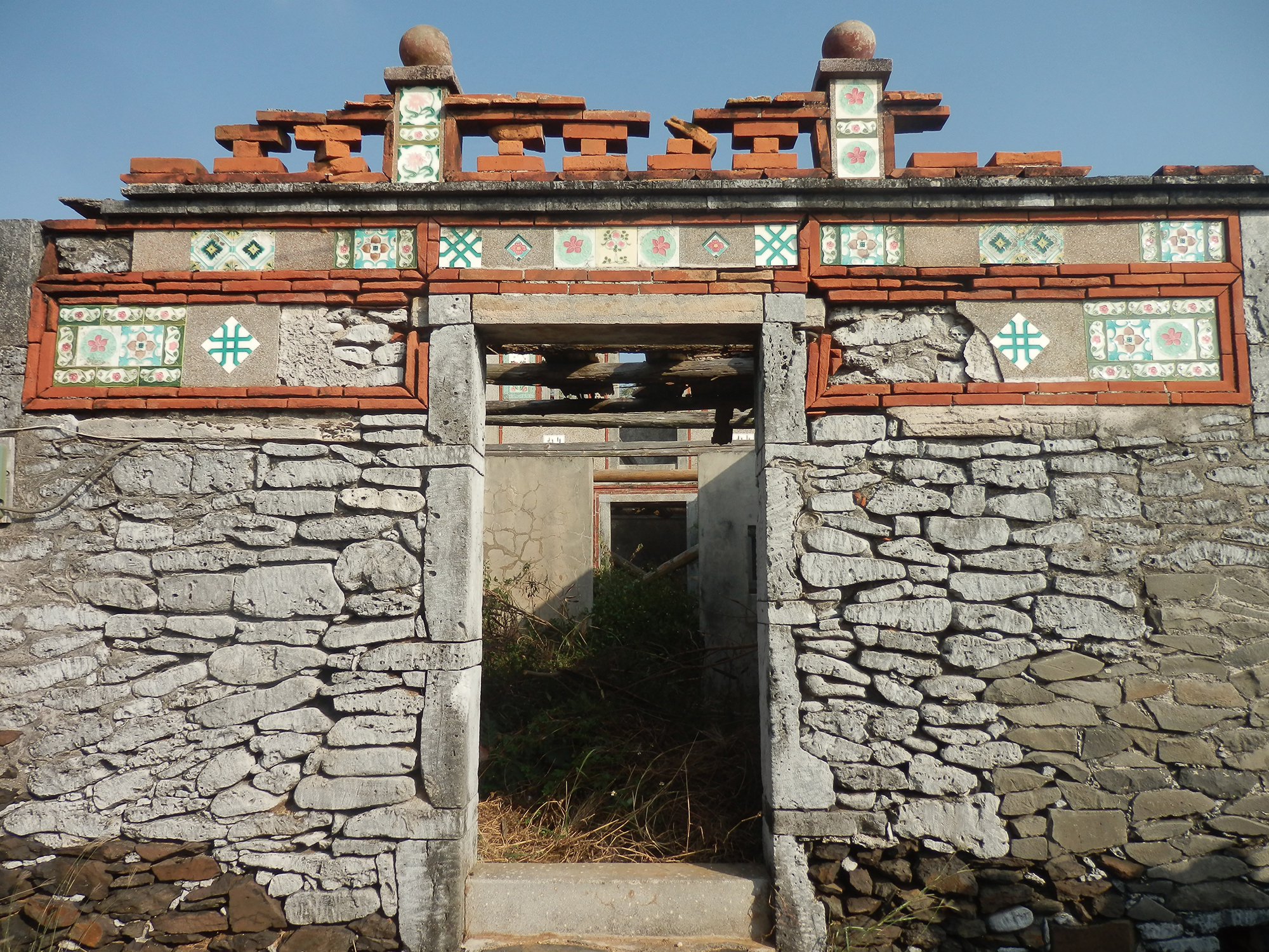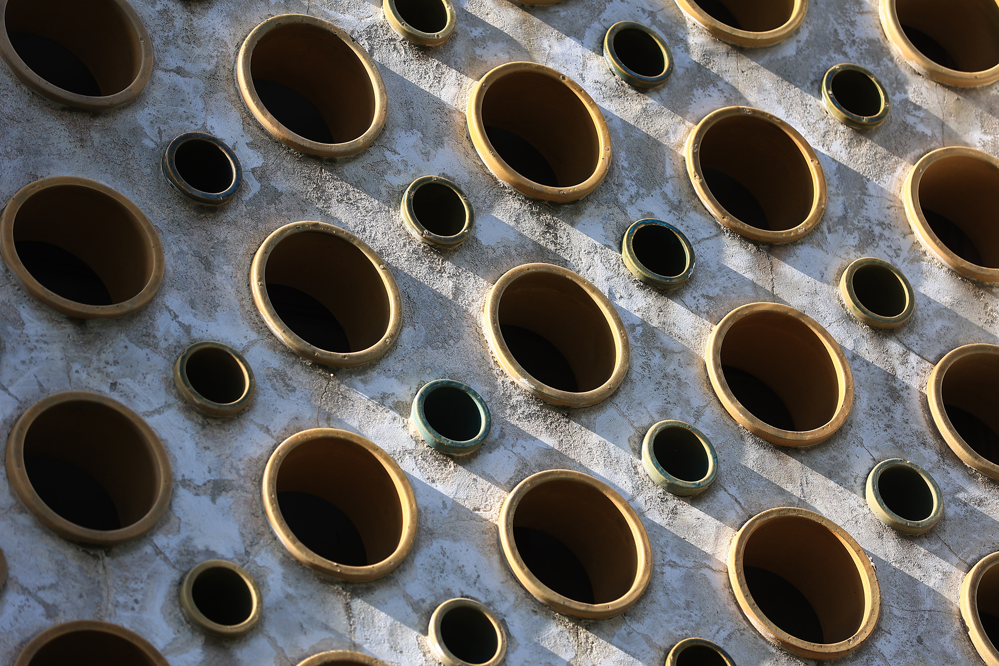 กระเบื้องที่มีลวดลายแบบดั้งเดิม นอกจากใช้ในการประดับตกแต่งแล้ว ยังคำนึงถึงการออกแบบให้มีช่องกลวง เพื่อให้แสงสามารถลอดผ่านเข้ามาได้ และง่ายต่อการระบายอากาศ