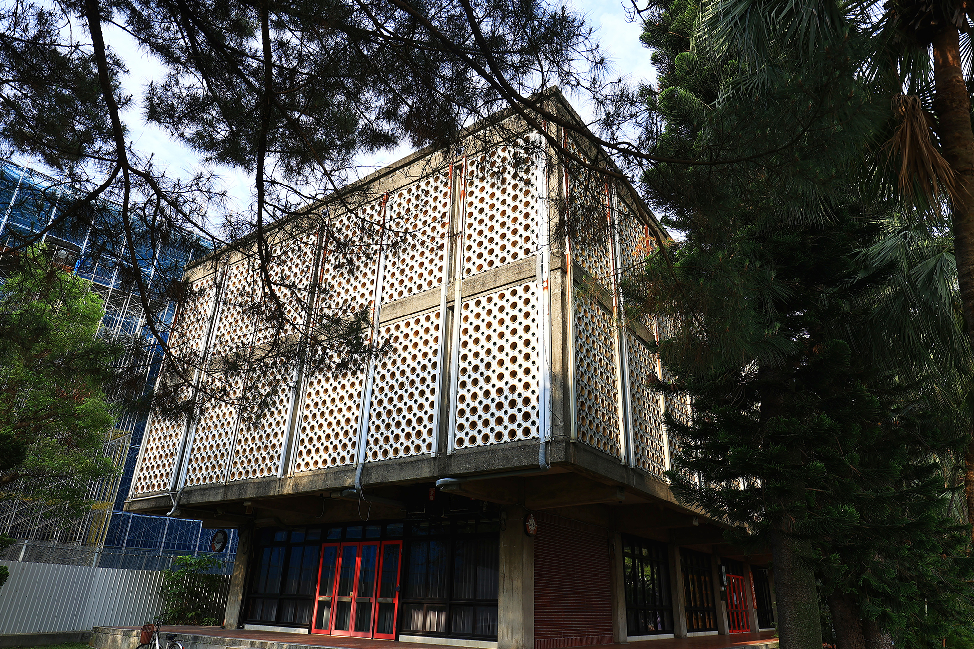 อาคารนิทรรศการการเกษตรของมหาวิทยาลัยแห่งชาติไต้หวัน ถือเป็นอาคารสมัยใหม่ในยุคหลังสงครามโลกครั้งที่ 2 สร้างขึ้นในปี ค.ศ. 1963 โดยมีจางจ้าวคัง เป็นสถาปนิกผู้ออกแบบ เป็นที่รู้จักทั่วมหาวิทยาลัยในชื่อ“ตึกรู” เนื่องจากมีการใช้ท่อเซรามิกในการออกแบบช่องหน้าต่างบนผนังอาคารด้านนอก