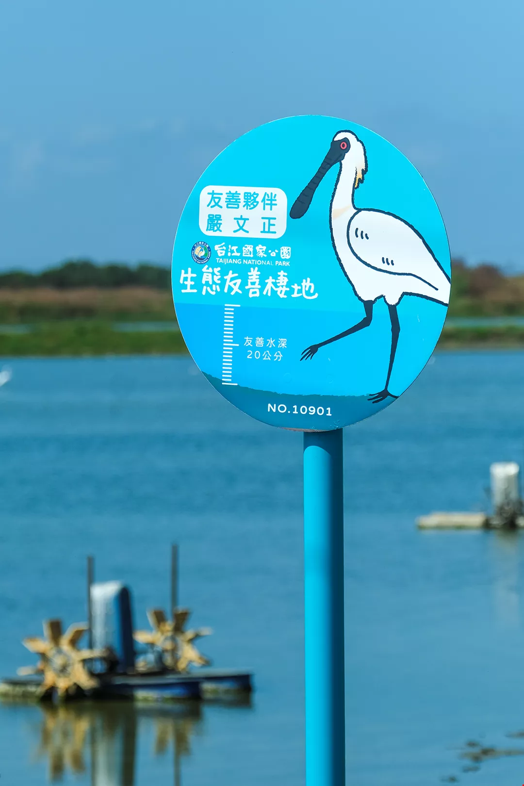 เมื่อเรามาถึงบ่อปลาอีกแห่ง กัวตงฮุยชี้ไปที่ป้ายข้างสระน้ำให้เราดู เป็นมาตรการ “การสร้างระบบนิเวศเป็นมิตรสำหรับที่อยู่ของสัตว์” เป็นสิ่งที่อุทยานแห่งชาติไถเจียงผลักดันส่งเสริมให้ชาวประมงหลังจับปลาในบ่อไปแล้ว ให้รักษาระดับ น้ำลึกไว้ที่ 20 เซนติเมตร และเหลือปลาตัวเล็กไว้เป็นอาหารสำหรับนกปากช้อนหน้าดำ