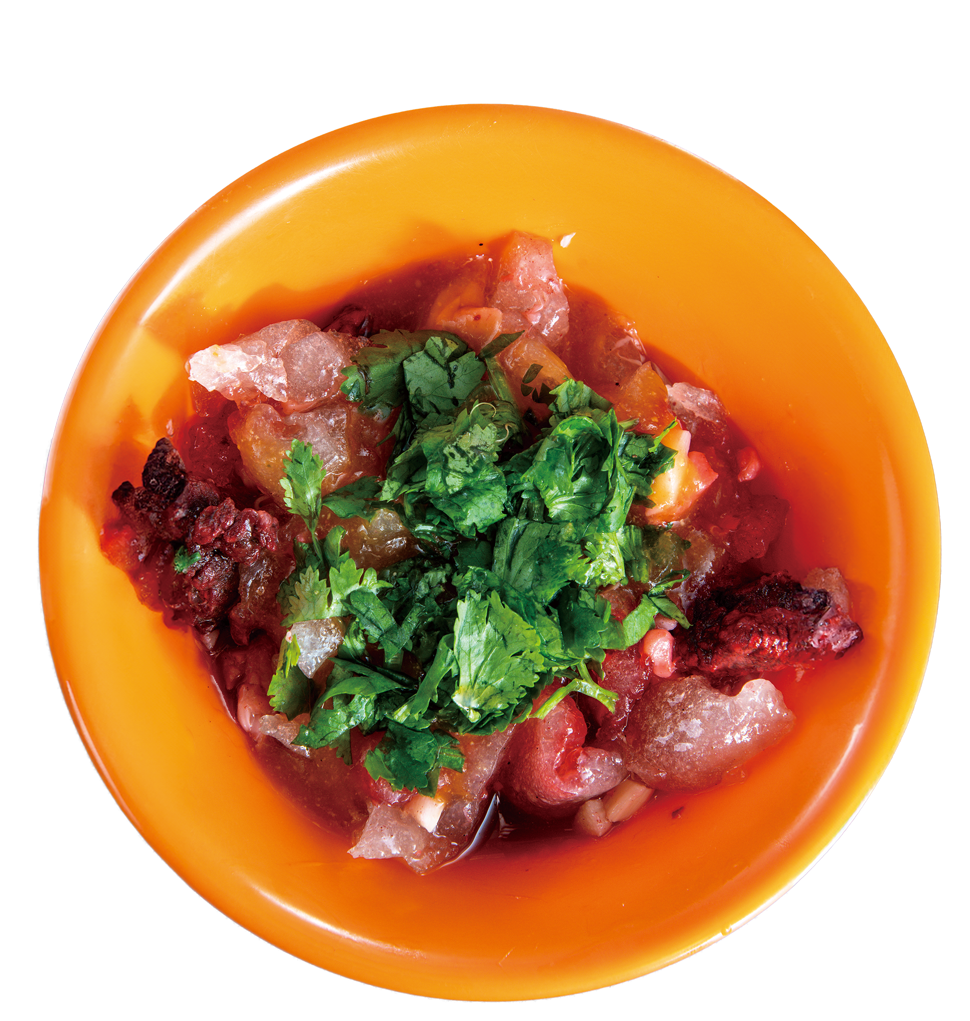 คุณเฉาหมิงจงเล่าว่า “อาหารว่างของเมืองจีหลง คือสิ่งที่เกิดขึ้นจากการแลกเปลี่ยนกันระหว่างกลุ่มผู้ย้ายถิ่นในแต่ละยุคสมัยกับวัสดุท้องถิ่น” เขายกตัวอย่างโดยไม่ต้องเสียเวลาไตร่ตรองว่า อาหารที่ปรุงรสด้วยน้ำกากส่าแดงหรือวีแนสแดง (Red vinasse) ซึ่งพบเห็นทั่วไปในเมืองจีหลงก็เป็นอาหารที่มาจากเมืองฝูโจวของจีนแผ่นดินใหญ่ “วีแนสแดง” ภาษาจีนคือ紅糟 (อ่านว่า หงเจา) มีสีแดงสดและมีรสหวานจากยีสต์ข้าวโคจิ เป็นเครื่องปรุงรสและสีย้อมอาหารจากธรรมชาติที่ชาวฝูโจวนิยมใช้ในการปรุงอาหาร