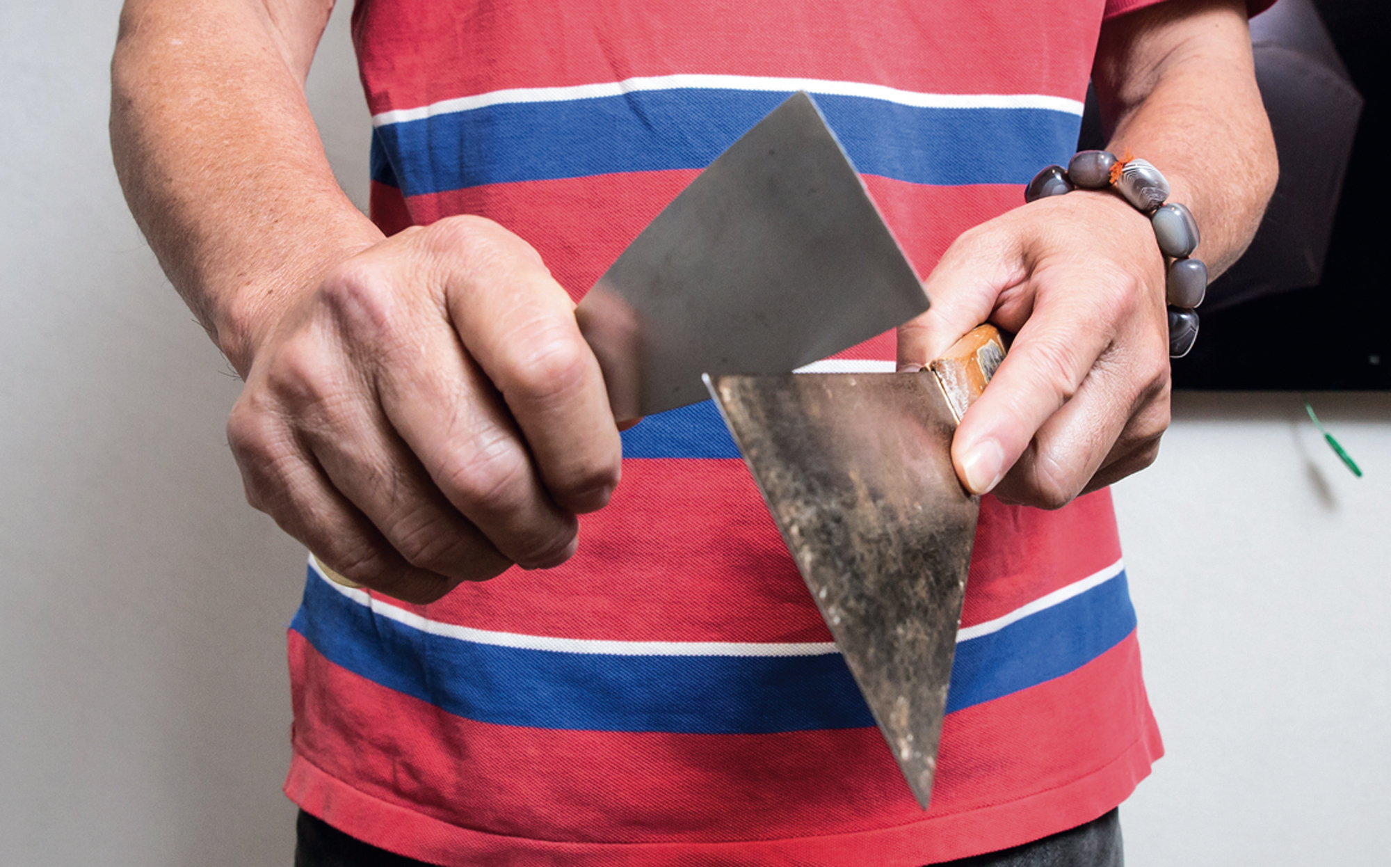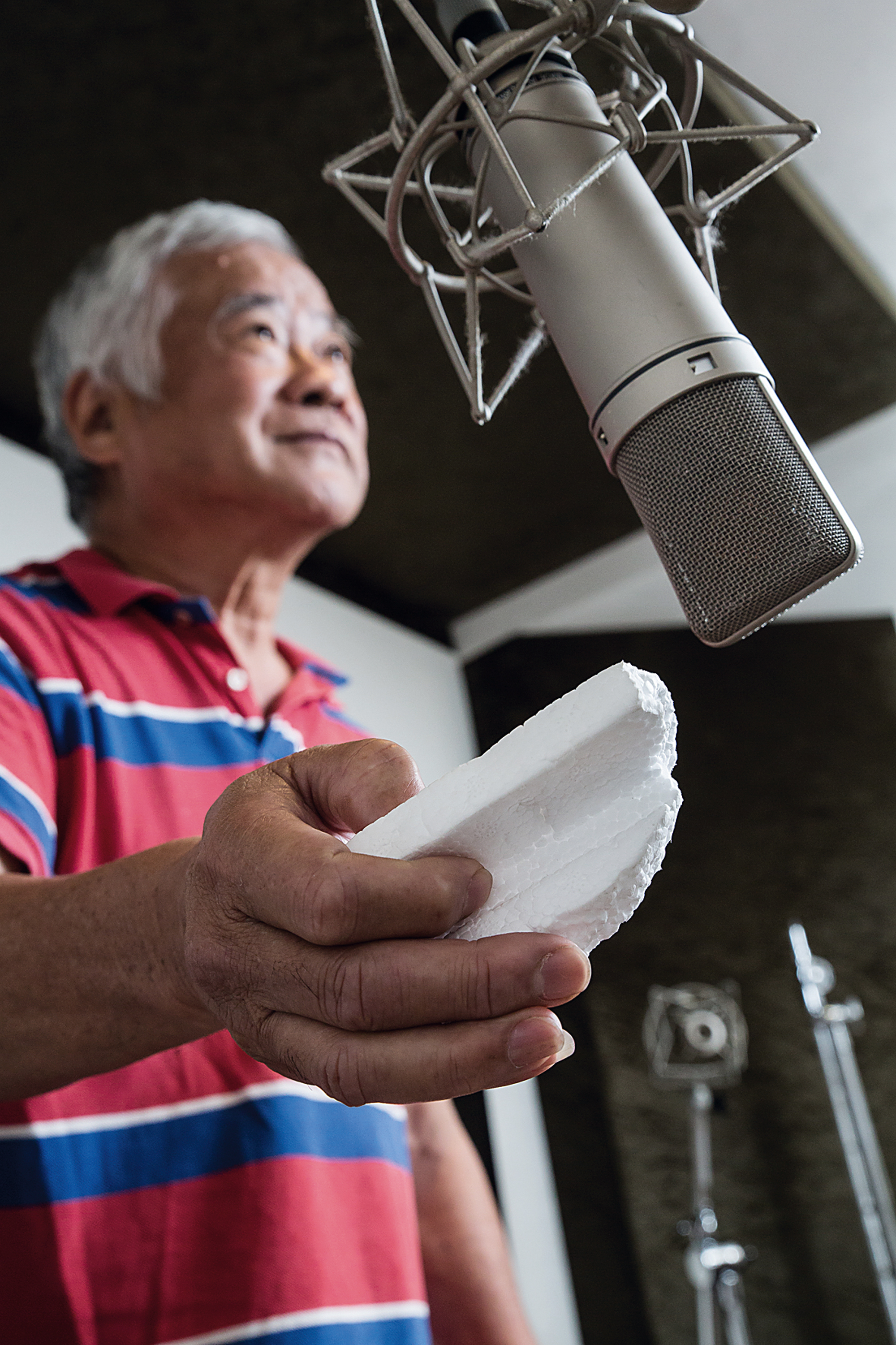 他創造聲音的工具五花八門,手掐著保麗龍,按壓再放鬆,就能再現扁擔晃動時「嘰拐嘰拐」的音效;手刷算盤呈現拉窗簾的聲音;用布丁杯在板子上敲擊製造噠噠的馬蹄聲。怎麼找到這些音源呢?就靠平常多觀察、多觸摸,「不能碰的東西不要碰,但可以碰的東西盡量去摸。」就是靠著這多年來東觸西摸累積的經驗,任何聲音都難不倒他。