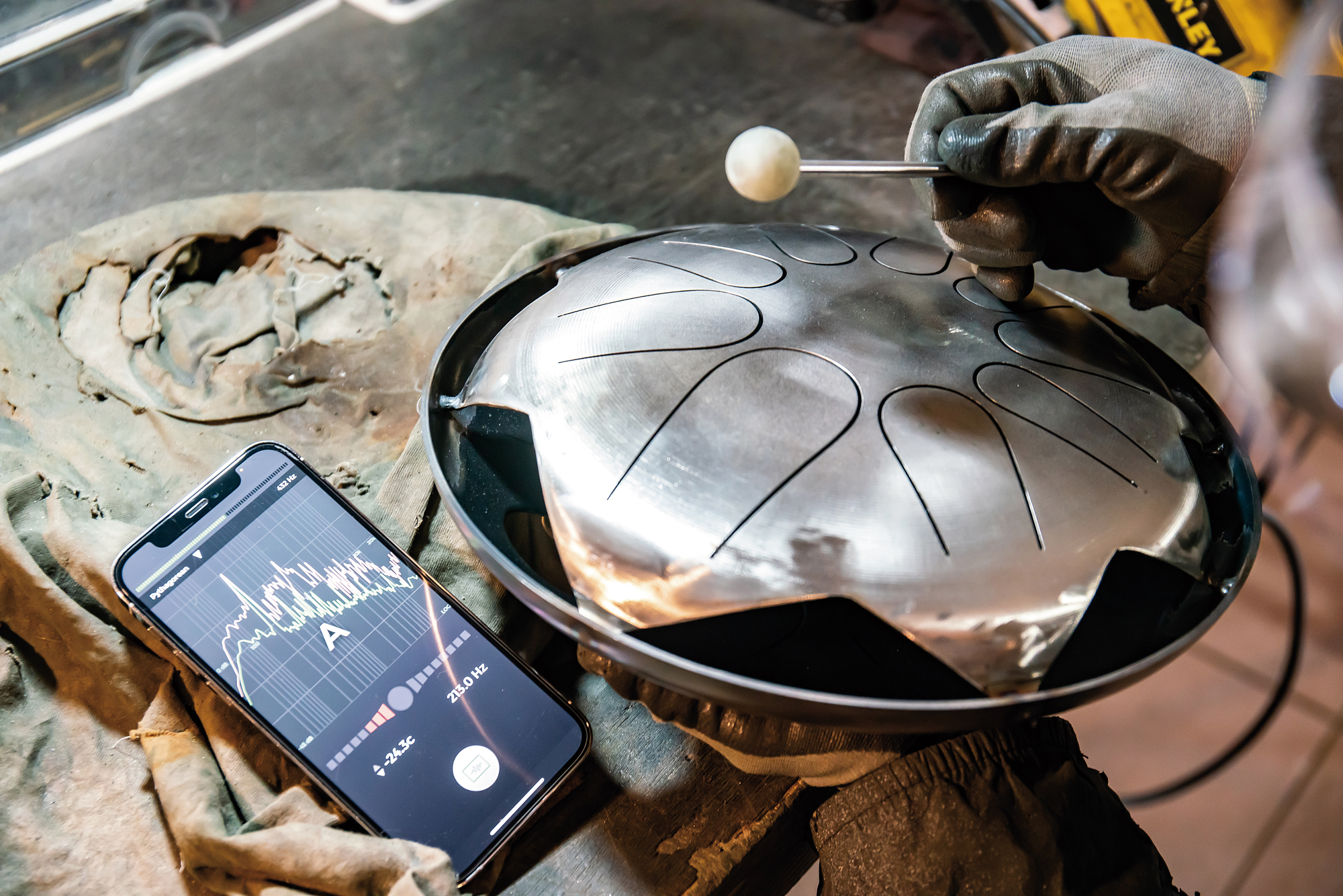他跟家人借了幾千塊,買下最基本的切割機、砂輪機,在自家頂樓開工,取廢棄的瓦斯桶為材料,參考網路上的資料、影片,將瓦斯桶去頭去尾,切下桶身的兩端,再重新焊接,切割出音舌,再經過調音,完成最粗糙的原型。