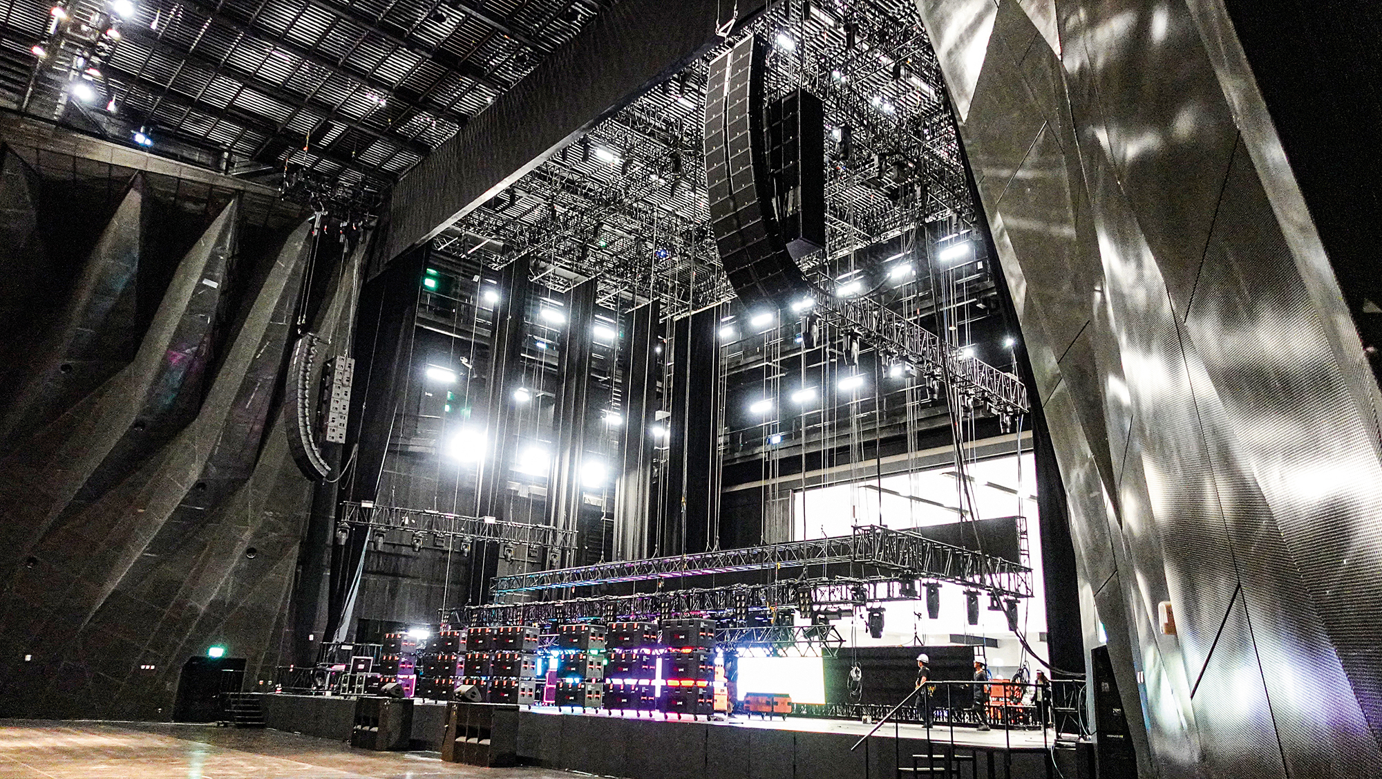 量身訂製的高規格L-Acoustics K2 音響系統,讓射程可以達到最完美的表現,提供給不同區域的觀眾最高品質的聲音。堅實的母桁架(mother truss)可直接降至一樓平面架設機具,減少工作人員上貓道,進行高空作業的機率,大幅降低場佈的危險性。電腦操控的電動升降舞台可被視為底台,高低落差將近三層樓,載重750公斤,不但環保,也減少架設時程。電動升降舞台區分為14塊,兩種大小,無論是階梯式的舞台高度,或是舞台劇愛用的前低後高band pool模式,都可以完美配合。