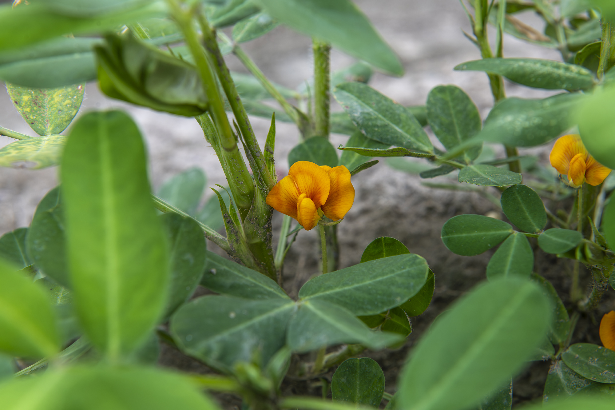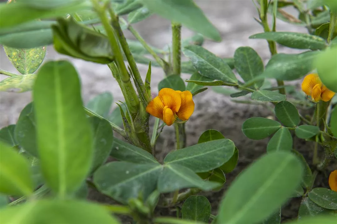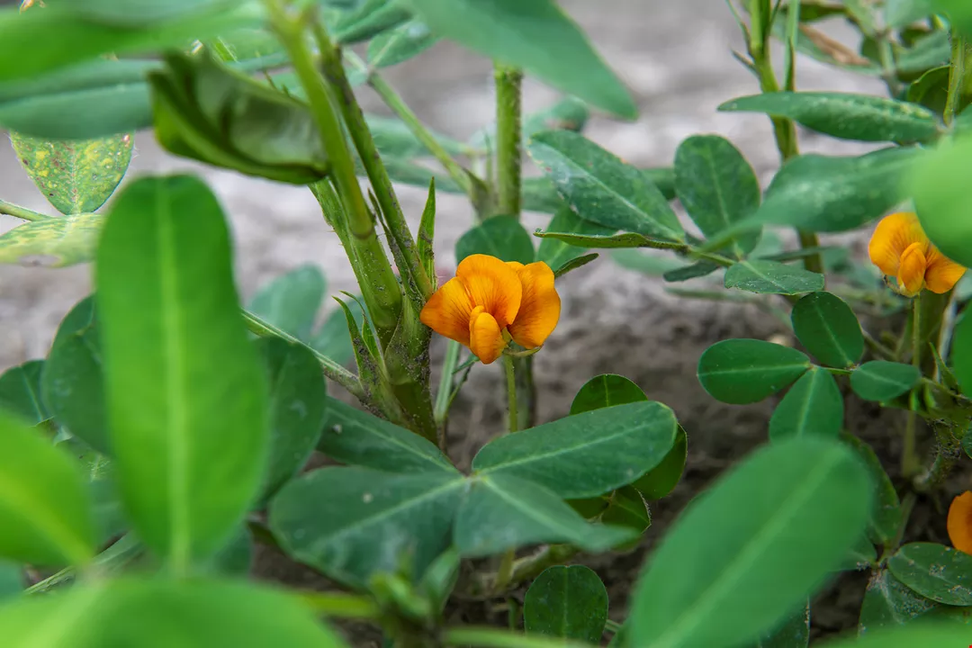 Ruộng đậu phộng xanh mướt được điểm xuyết bởi những cánh hoa vàng nhỏ xinh.