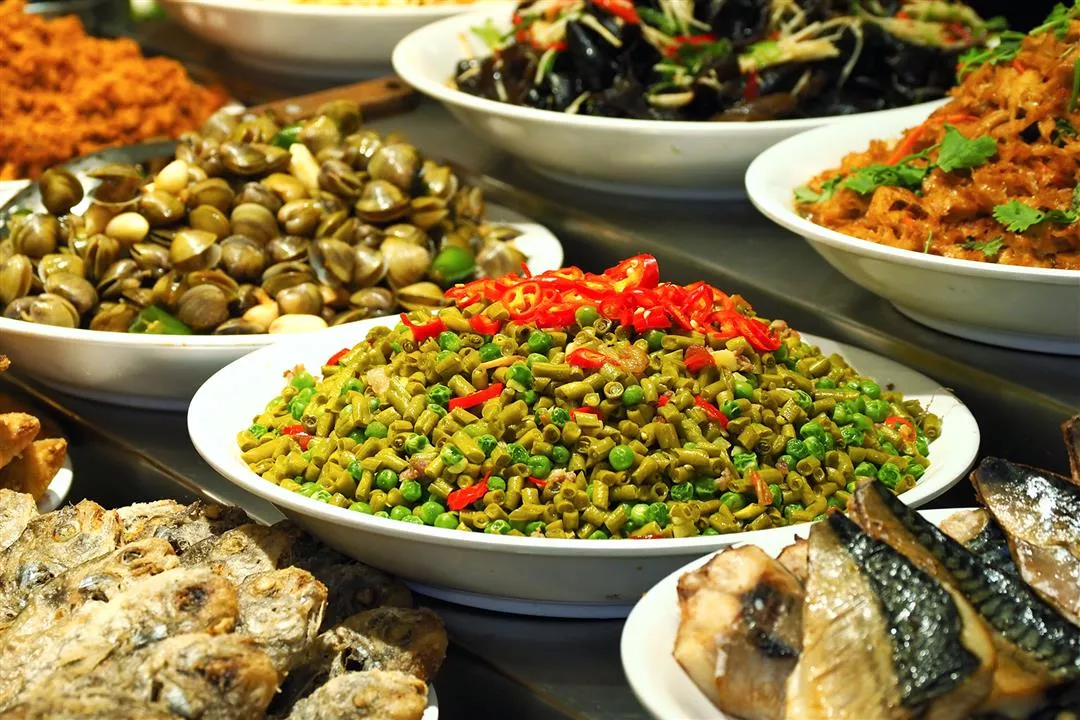 Các món ăn bày trên kệ phong phú, đa dạng đầy màu sắc thơm lừng khiến thực khách không thể kìm lòng.