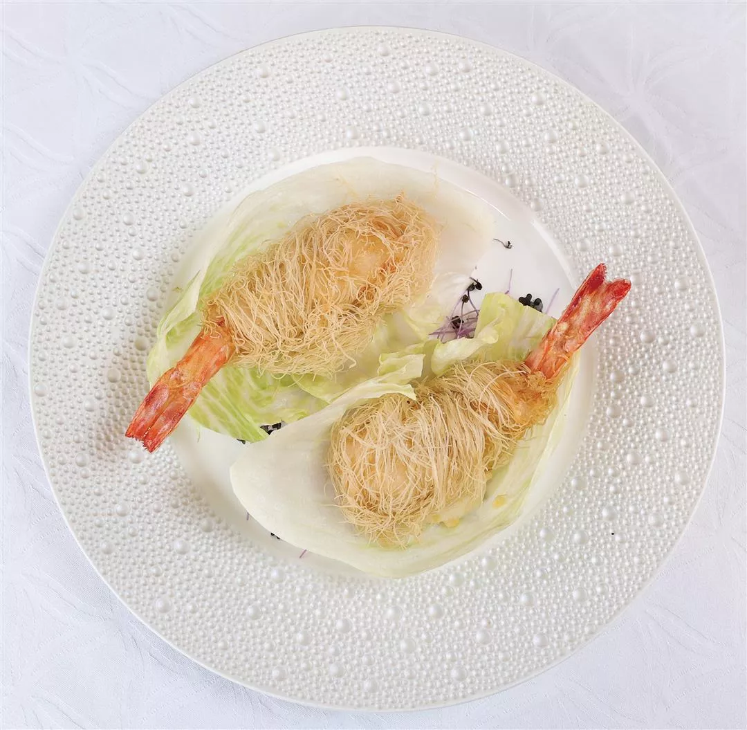 Dùng mì chỉ quấn tôm trong (tôm nương) đã cắt bỏ đầu, chiên ngập dầu cho đến khi giòn rồi dùng kèm với rau sống. Món này thể hiện sự khéo léo và kỹ năng chiên của các đầu bếp Đài Loan.