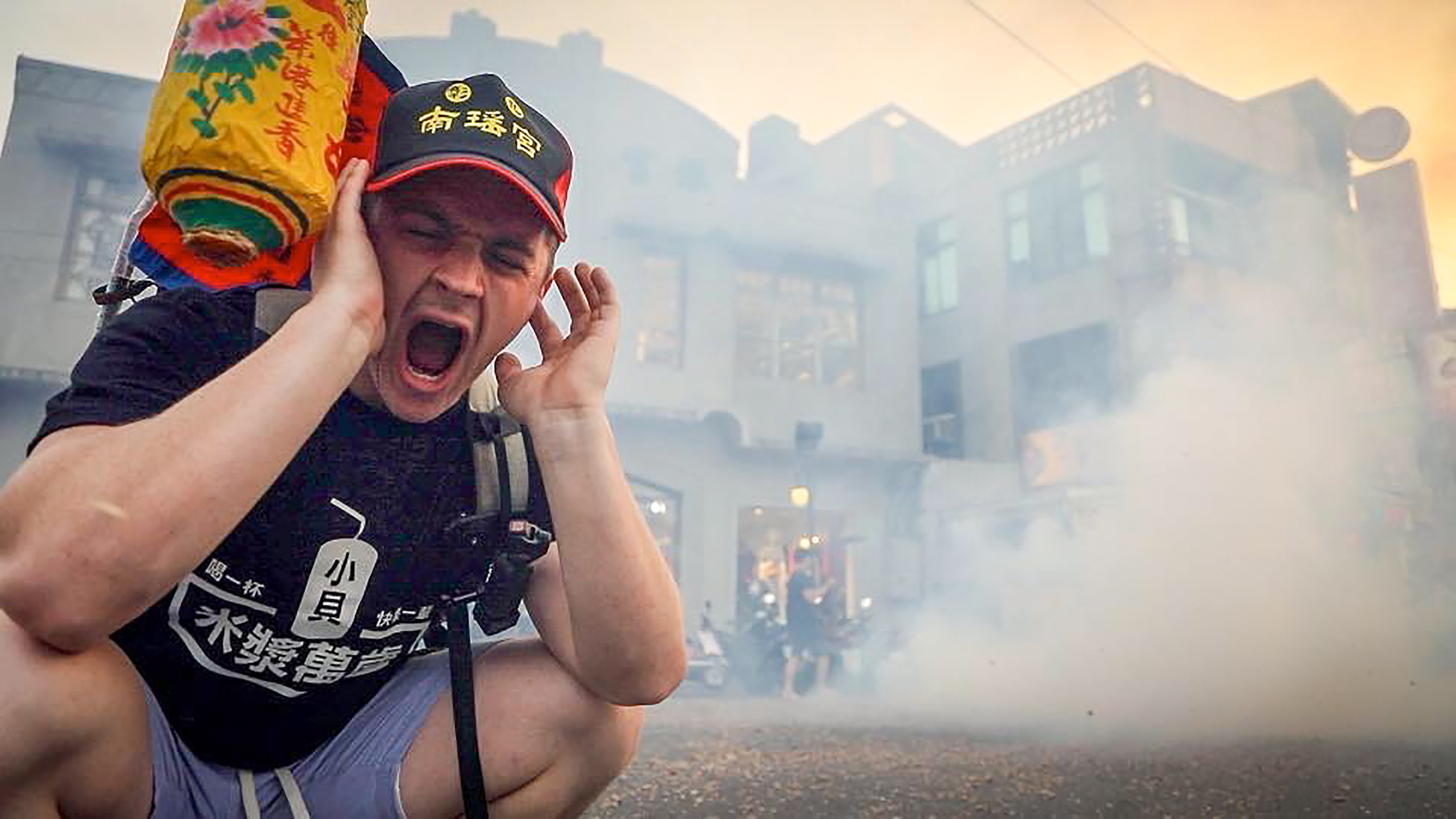 Logan Beck yêu thích không khí náo nhiệt được tạo ra bởi tiếng pháo, trong ảnh là cảnh anh đang tham gia hoạt động hành hương của đền Nam Dao tại Chương Hóa. (Ảnh: Logan Beck cung cấp).