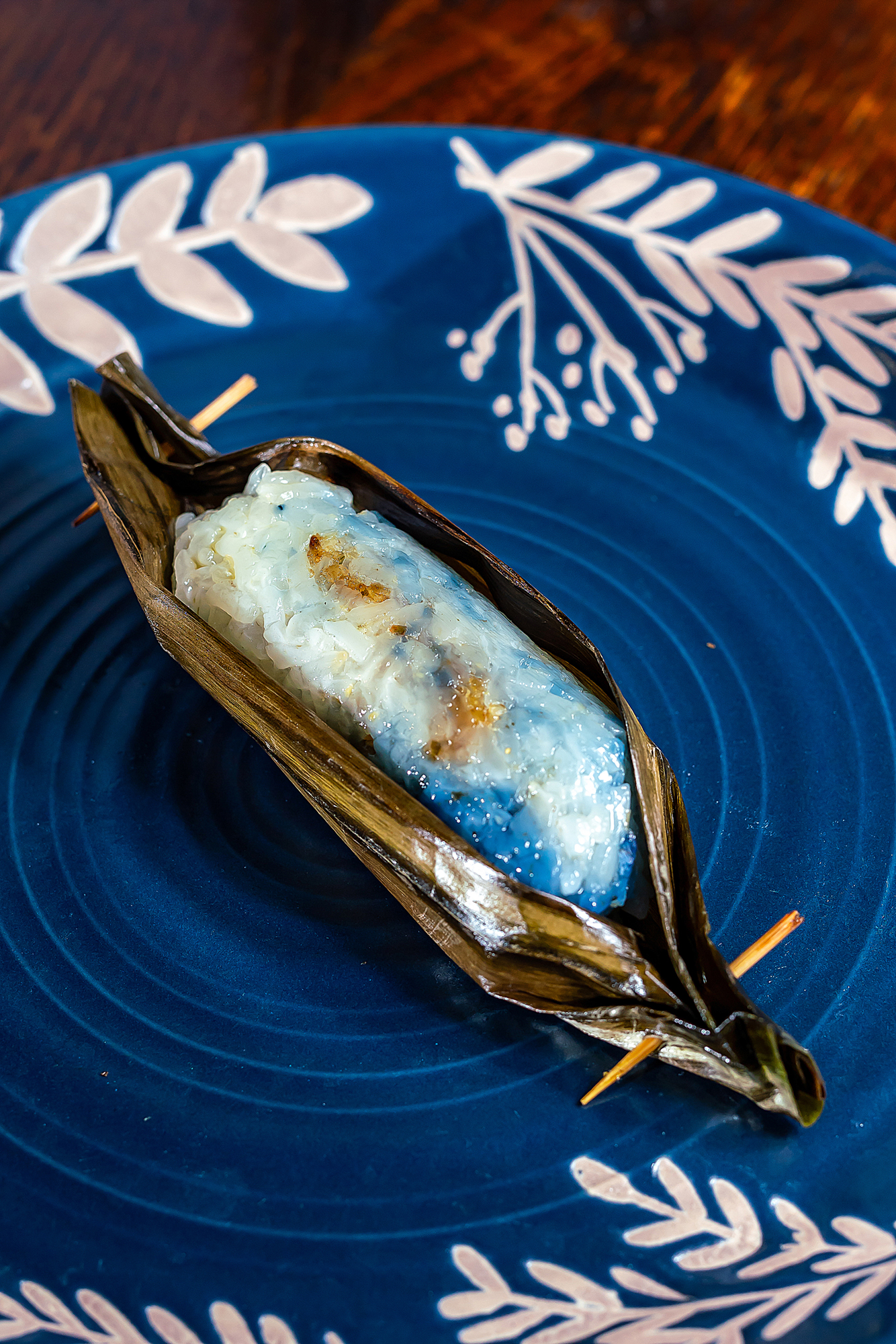 Bánh nếp cuộn Rempah Udang nhân ớt và tôm khô được gói bằng lá dứa và nhuộm màu bằng hoa đậu biếc.