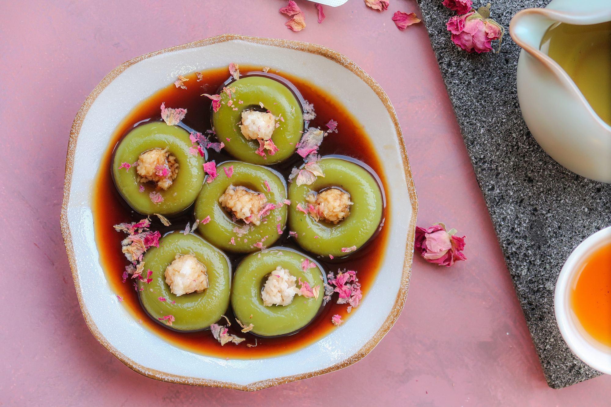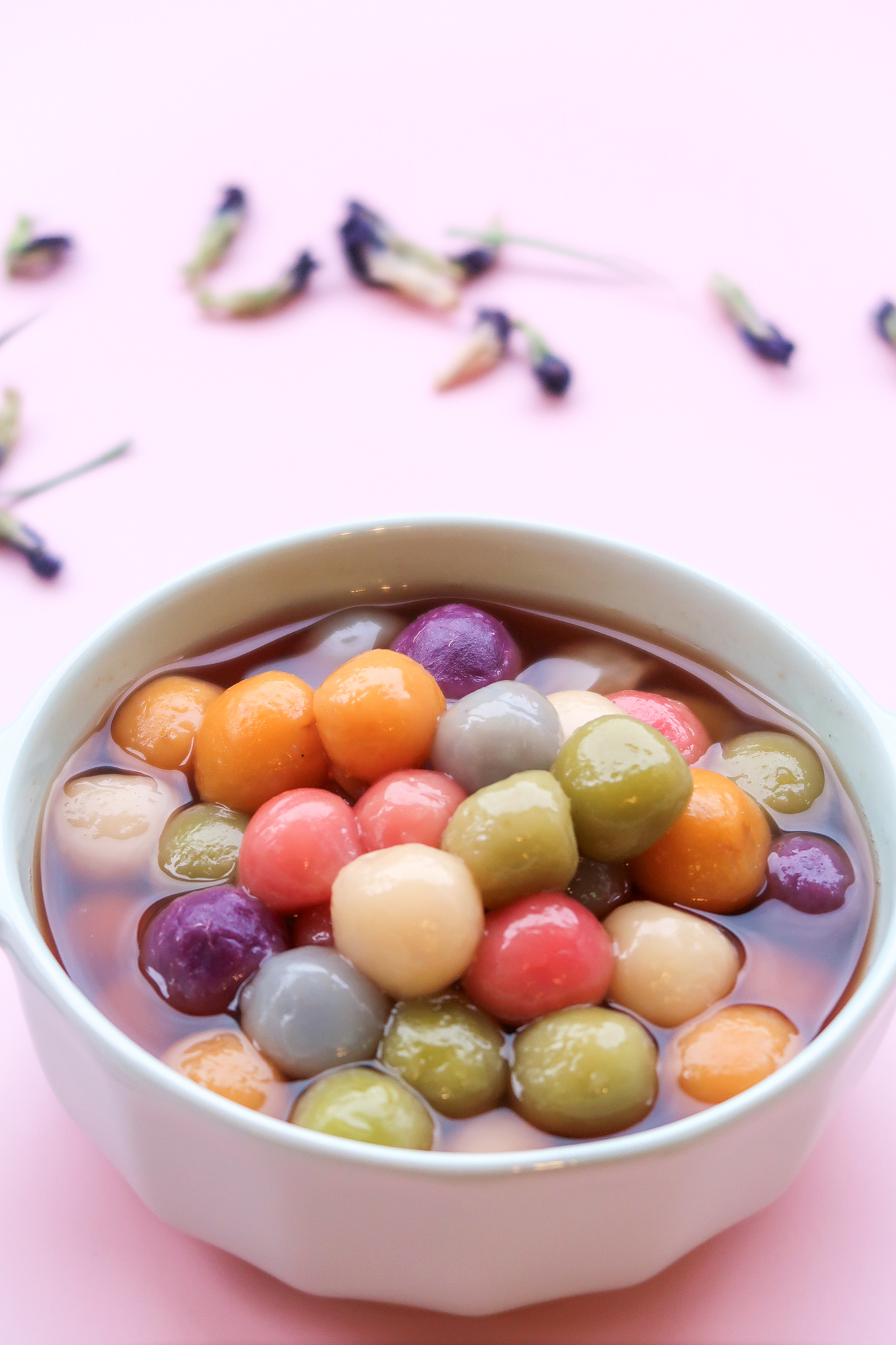 Những chiếc bánh trôi kiểu Nam Dương do cô Lưu Minh Phương mang ra, ngoài tận dụng khoai lang, lá dứa và nước ép xương rồng để tạo ra nhiều sắc màu rực rỡ, còn nấu nước đường bằng lá dứa, đường cọ và gừng tươi. (Ảnh: Lưu Minh Phương cung cấp)