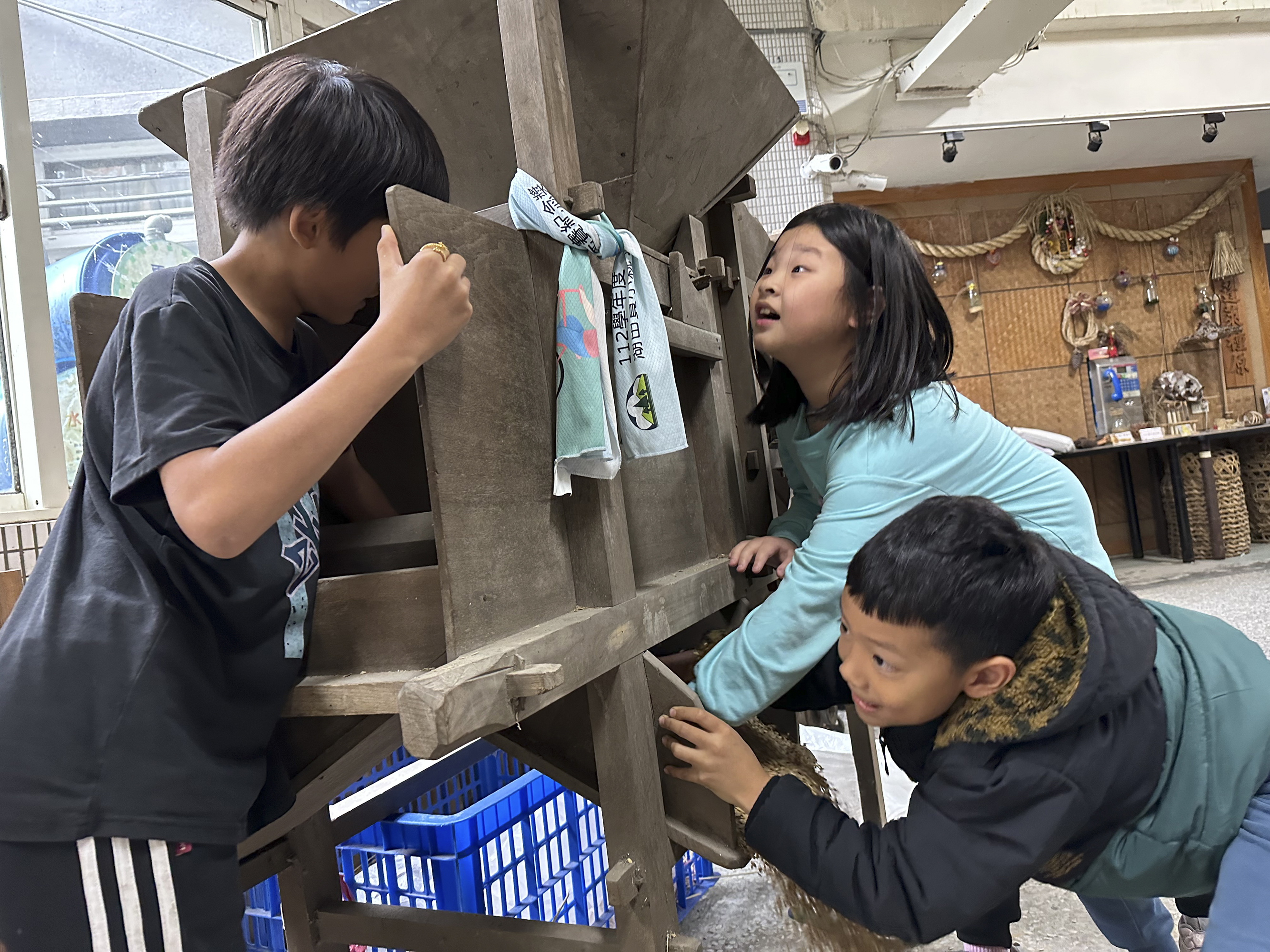 Khi nhìn thấy chiếc máy quạt lúa hiếm gặp đang hoạt động, các em học sinh trường tiểu học Hồ Điền liền háo hức cùng nhau trải nghiệm. (Ảnh: Mei Kuo)