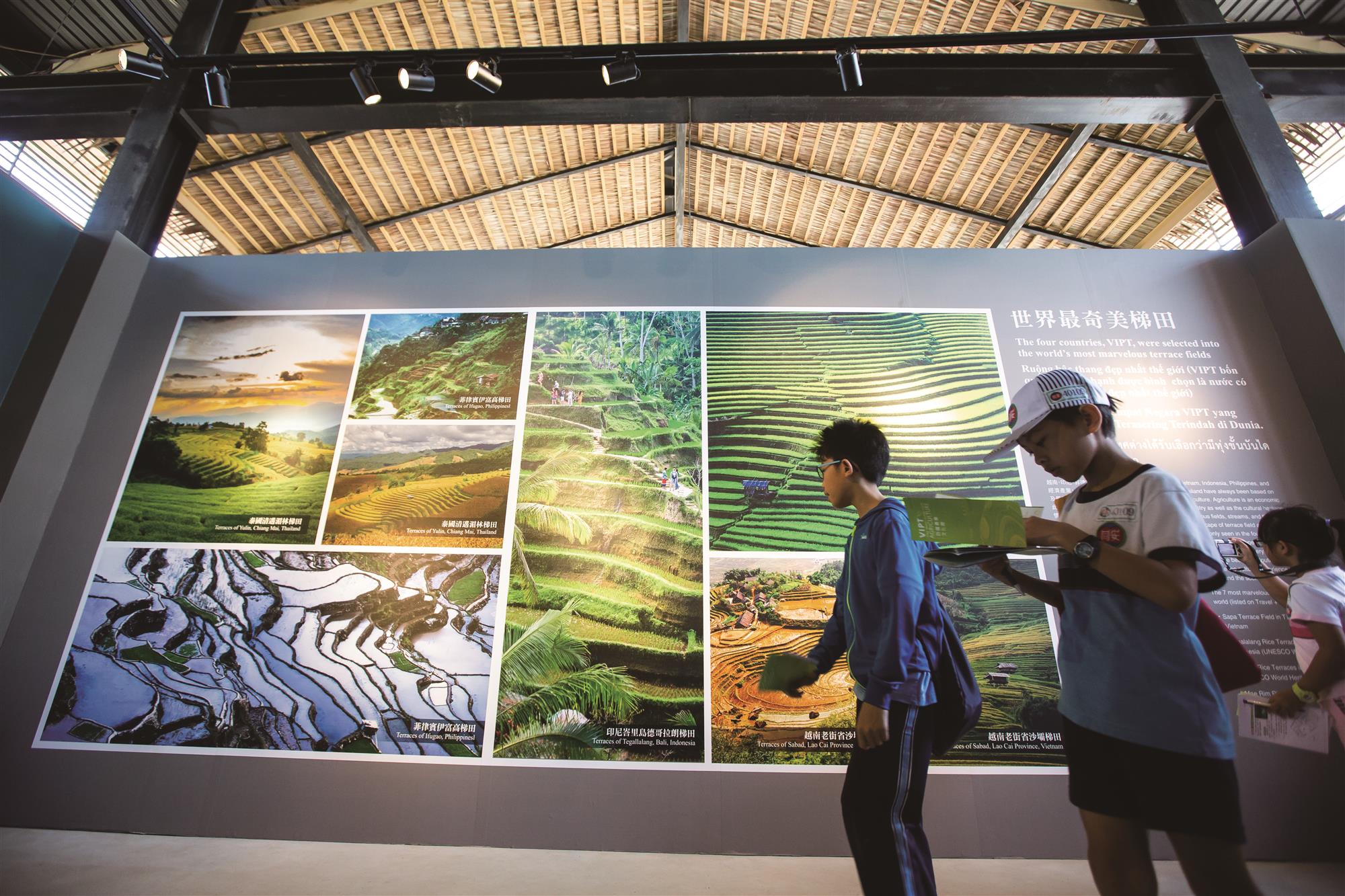 Dùng ruộng bậc thang làm chủ đề, xây dựng kiến trúc khu gian hàng văn hóa 4 nước và cảnh quan sân vườn