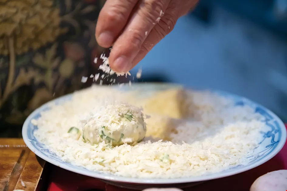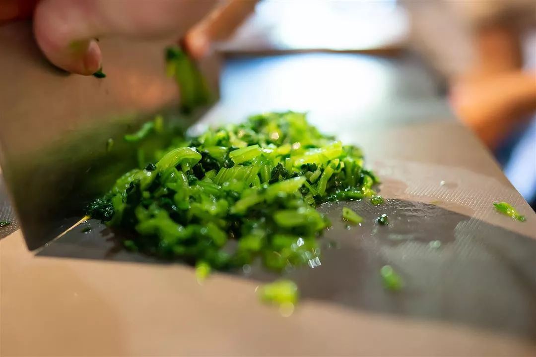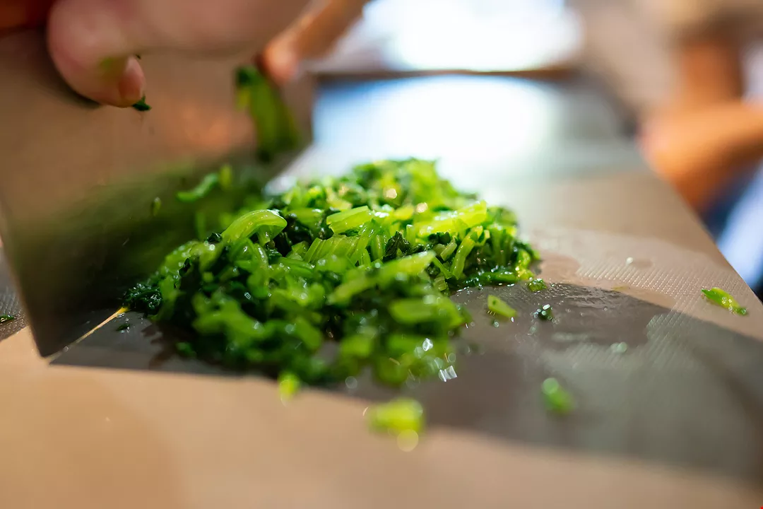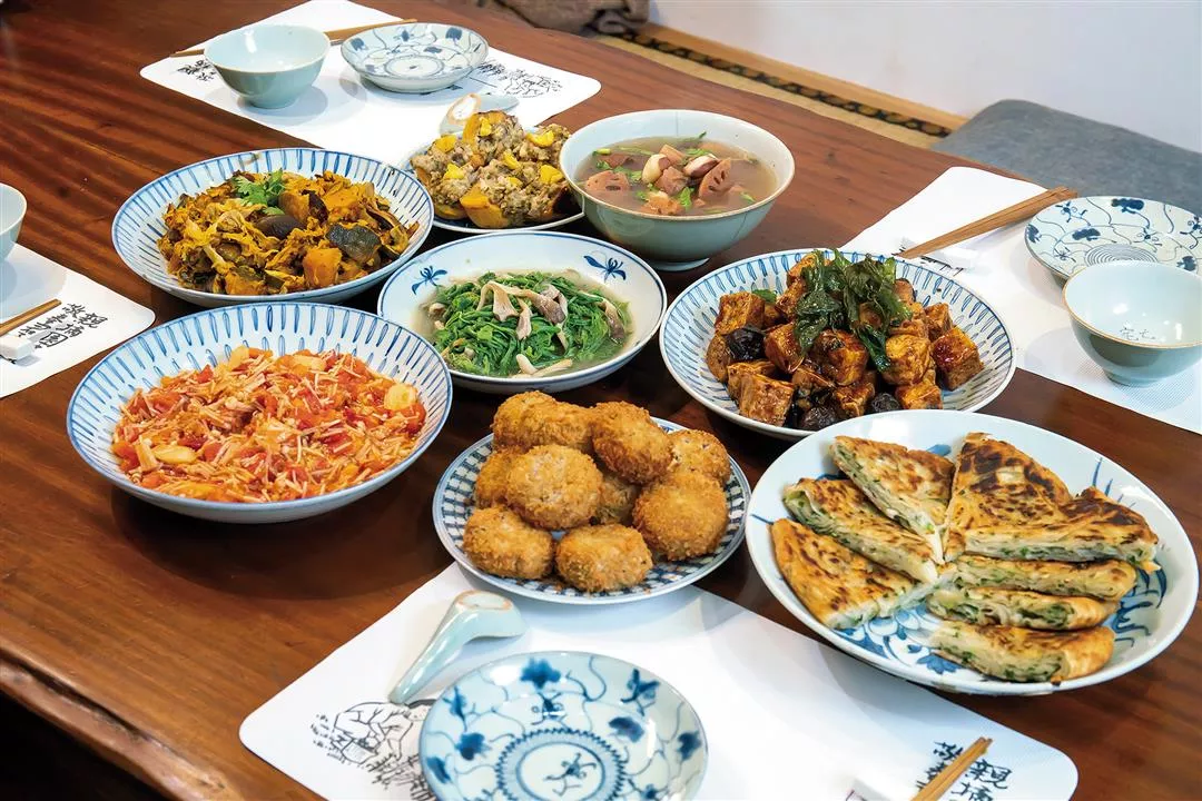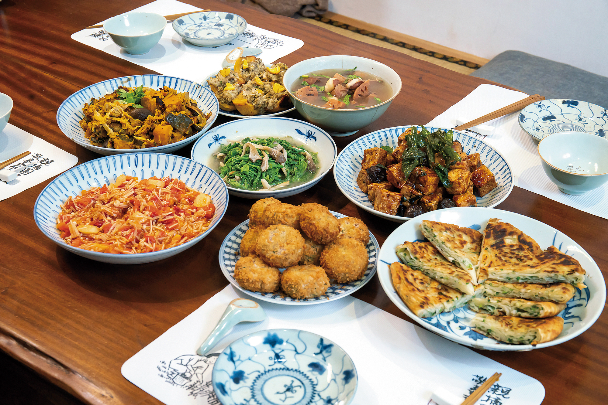 Sau một buổi sáng bận rộn, bà Vương Bồi Nhân bày ra cả một bàn đầy thức ăn, ngoài món bánh bột mì chiên gia truyền nguyên quán Sơn Đông, còn có những món chay rất kỳ công như khoai môn viên nhân thịt chay, trái hồng nướng với củ mài và hạt dẻ nghiền nhuyễn, ngoài ra còn điểm xuyết thêm bằng các món có hương vị cơm nhà như củ năng xào với cà chua và nấm kim châm, đậu phụ thối kho nước mơ tía tô, không những đa dạng về nguyên liệu và có nhiều cách làm khác nhau mà hương vị cũng rất phong phú.