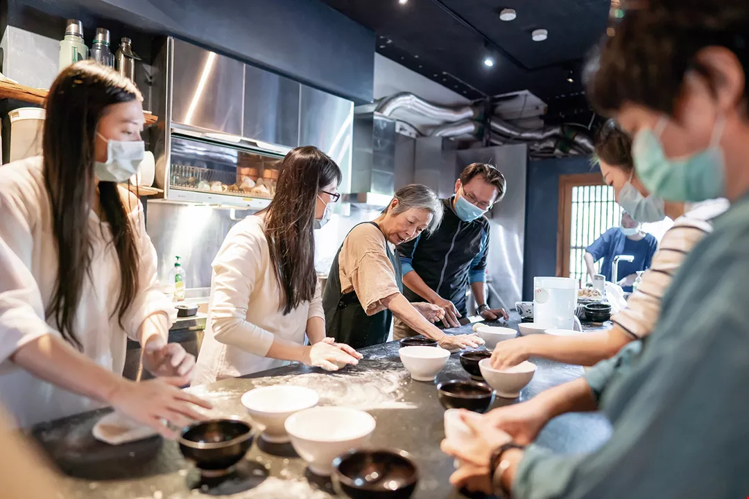 Vào ngày phỏng vấn, chúng tôi đến thăm lớp dạy nấu ăn của bà Vương Bồi Nhân ở dưới chân núi Tiên Tích Nham (Xian-ji-yan) - Cảnh Mỹ (Jing Mei). Cho dù nằm sát con đường tấp nập xe cộ qua lại nhưng toàn bộ không gian này được bao quanh bởi cây cỏ hoa lá, đi theo con đường lát đá phiến sẽ vào tới kiến trúc xây bằng gỗ, trên tường được trang trí bằng những tác phẩm thư họa, bàn ăn sử dụng bát đĩa cổ, chẳng khác nào là cảnh đẹp bí mật của “chốn tiên cảnh nhân gian”, thoát khỏi mọi sự ưu phiền cõi trần thế.