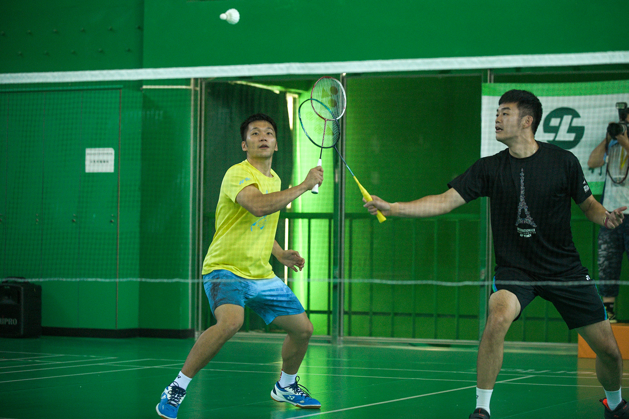 Cầu lông đánh đôi đòi hỏi 2 người phải phối hợp nhịp nhàng, ăn ý. Khi Lý Dương (phải) phòng thủ thành công, thì Vương Tề Lân có thể lập tức phán đoán chiến thuật tiếp theo (Ảnh: Sở TDTT, Bộ Giáo dục cung cấp )
