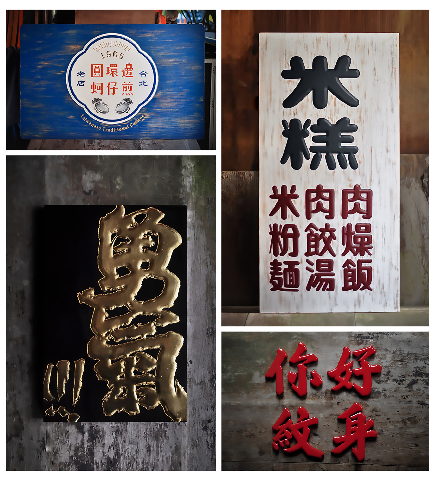 Đến bảng hiệu của Hello Tatto Studio thì ông Tài mới một lần nữa cầm bút, dùng thể chữ nổi để làm nên tấm bảng hiệu mang đậm phong cách xưa. Tiệm bánh Hàu chiên Yuanhuan trong chợ đêm Ninh Hạ (Ningxia), Đài Bắc là quán ăn hè phố Đài Loan từng được cẩm nang Michelin giới thiệu. Chủ quán ăn lâu đời này đã ủy quyền cho nhà thiết kế thiết kế bảng hiệu và nhờ Chen’s Wood làm thủ công, dùng kỹ thuật chạm nổi, làm bay màu sơn để trông bảng hiệu có dấu vết của thời gian, cộng thêm hình ảnh những con hàu trông thật tươi ngon trên bảng hiệu, tạo thành nét đẹp được kết hợp bởi món ăn vặt Đài Loan với thủ công mỹ nghệ truyền thống.