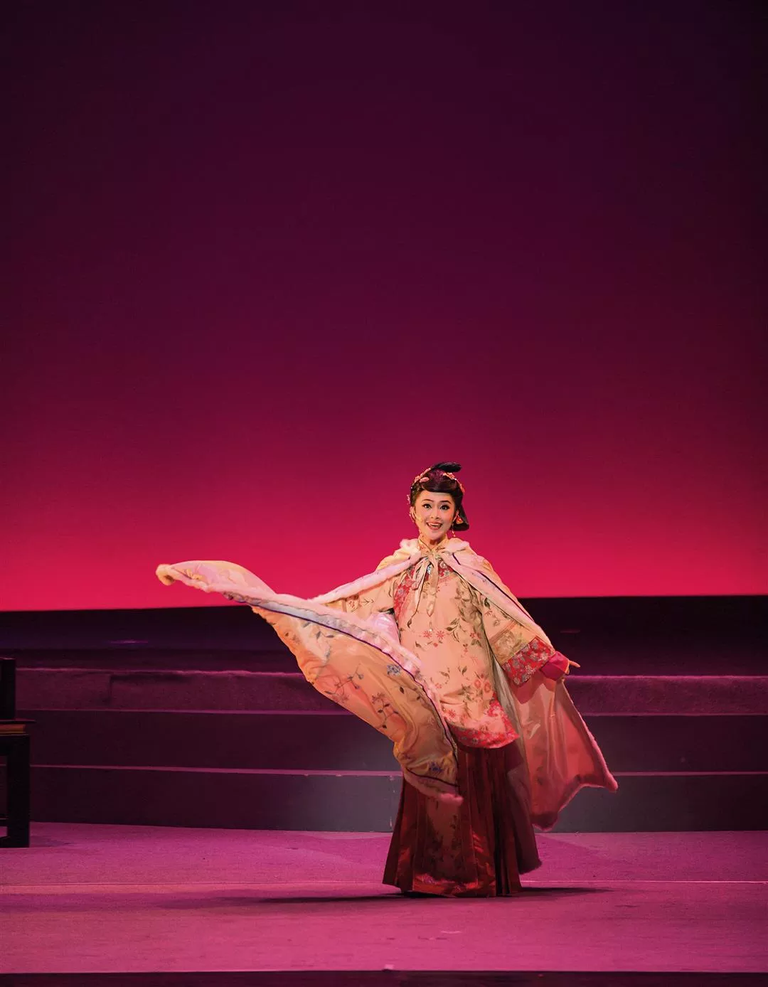 Đoàn kịch Rom Shing vô cùng cầu kỳ trong trang phục, không chỉ lộng lẫy, mà còn phù hợp thời đại và thân thế nhân vật. Trong ảnh là Phu nhân họ Lâm, vợ hai của ông Lâm Chiêm Mai trong vở “Tiềm Viên Phong Nguyệt”.