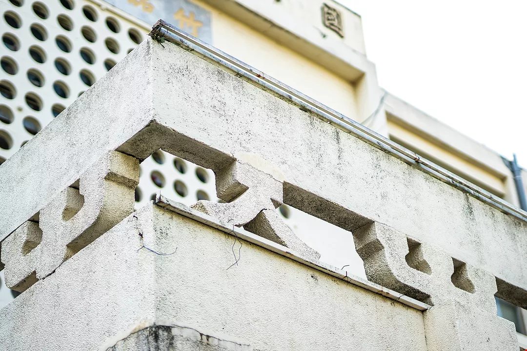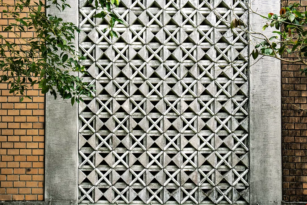 Khối kiến trúc thon dài như chiếc hộp hình chữ nhật là kiểu kiến trúc thường gặp trong thời kỳ Mỹ viện trợ Đài Loan. Ngoài cách trang trí thường thấy bằng gạch bông gió xi măng thì phần trang trí trên những bức tường còn sử dụng rất nhiều gạch rỗng. Giảng viên Khoa Kiến trúc Trường đại học Đạm Giang (Tamkang University) - ông Tạ Minh Đạt (Hsieh Ming-ta) giải thích, so với gạch mộc kiểu truyền thống, gạch rỗng dễ làm hơn rất nhiều. Ngoài yếu tố thời gian sản xuất ngắn, tỷ lệ hàng đạt chuẩn cao, 7 ngày sau khi ra lò là có thể sử dụng, sau 28 ngày sẽ đạt được cường độ nén cần có theo thiết kế. Ngoài ra, viên gạch rỗng cũng có thể tích to hơn, dễ căn chỉnh hơn nên sẽ thuận tiện dễ dàng hơn trong thi công. Vào đúng thời điểm ngành xây dựng của Đài Loan phát triển khá mạnh, gạch mộc cung không đủ cầu, vì vậy theo gợi ý của người Mỹ, rất nhiều công trình lúc bấy giờ đều sử dụng gạch rỗng.