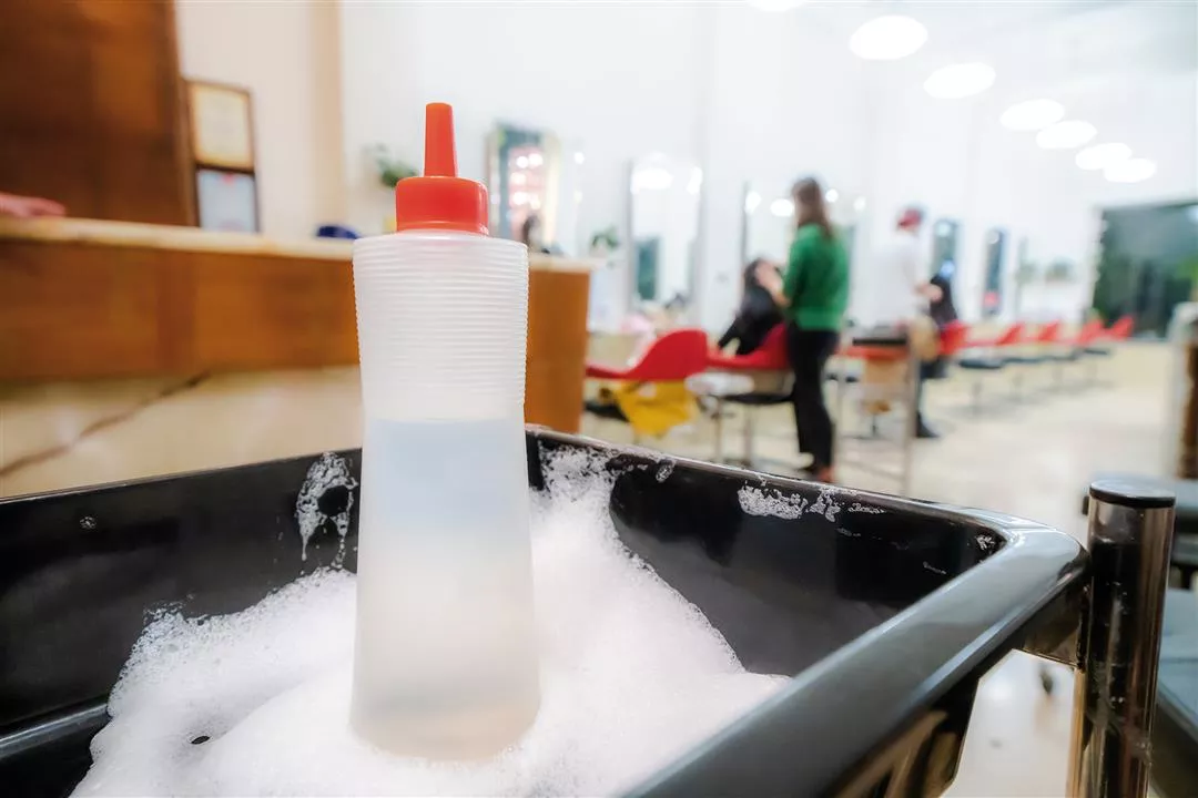 Cầm trong tay một chai nước gội đầu nhỏ, các nhà tạo mẫu tóc có thể phát huy khả năng nghệ thuật tạo bọt tóc trên đỉnh đầu.