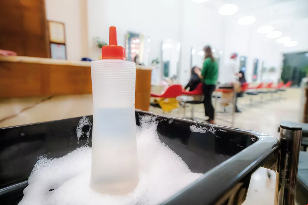 Cầm trong tay một chai nước gội đầu nhỏ, các nhà tạo mẫu tóc có thể phát huy khả năng nghệ thuật tạo bọt tóc trên đỉnh đầu.