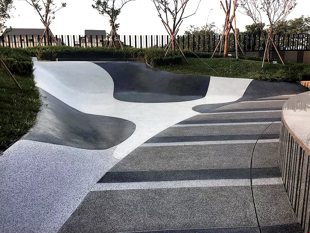 Anh Trần Bỉnh Nguyên xây dựng cầu trượt hình sóng trong không gian công cộng của một tòa nhà ở Cao Hùng. Bề mặt cong nhẵn bóng, cùng thiết kế pha màu tương phản, không sử dụng dây đồng phân cách làm tăng độ khó khi thi công.