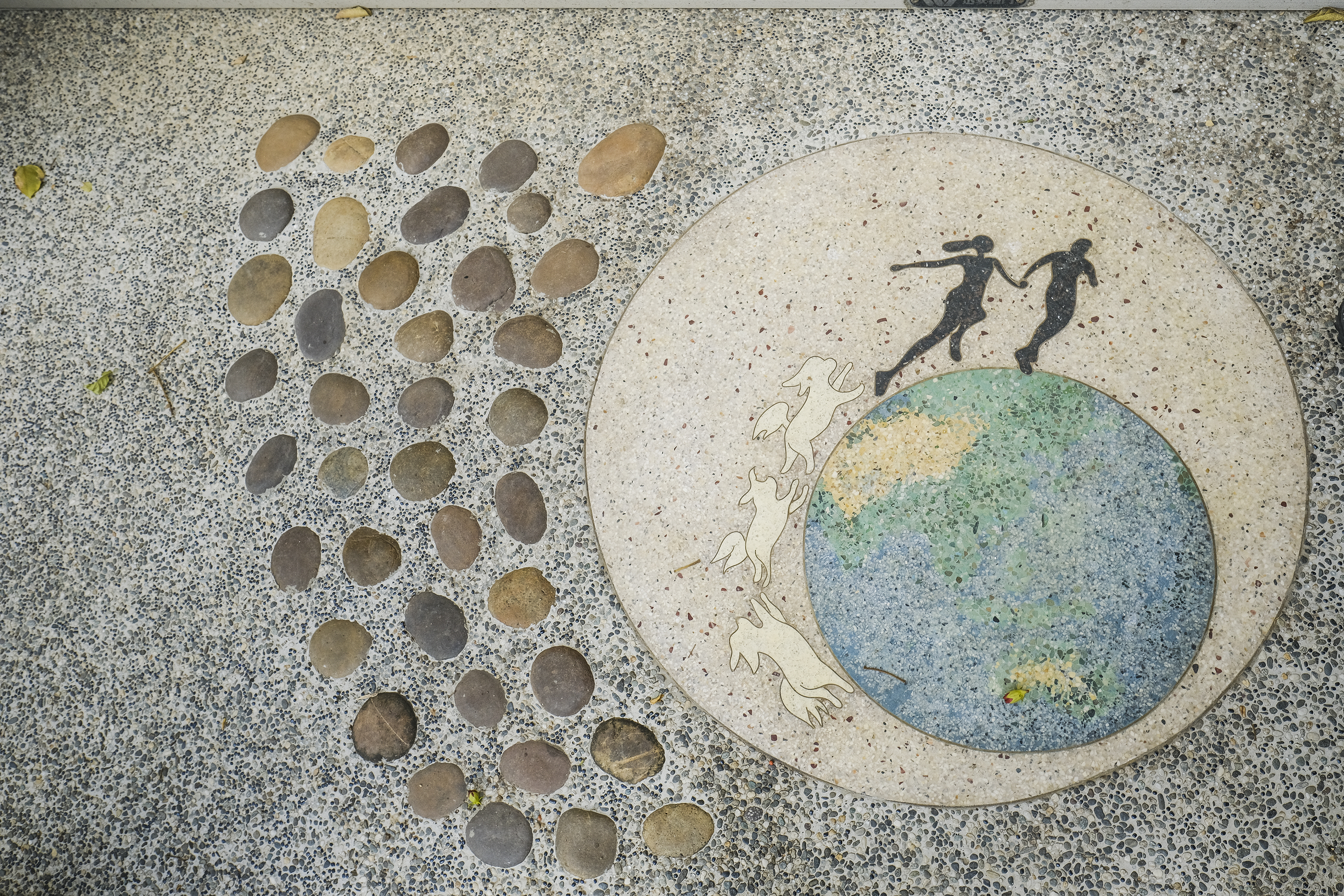 Cho đến ngày nay, người Đài Loan quen thuộc nhất với sàn khảm đá màu đen, màu xám và trắng, tượng trưng cho một số loại đá sản xuất tại địa phương. Sàn khảm đen là đá phiến từ cảng Ô Thạch (Wushi), huyện Nghi Lan (Yilan) hoặc khu Tam Địa Môn (Sandimen), huyện Bình Đông (Pingtung), sử dụng cùng một loại chất liệu với những ngôi nhà bằng đá đen của người dân tộc nguyên trú. Ngoài ra còn có đá cẩm thạch đen từ Nghi Lan, Hoa Liên (Hualien), Đài Đông (Taitung). Đá trắng và sỏi xám trắng cũng thuộc loại đá cẩm thạch sản xuất từ phía Đông Đài Loan.