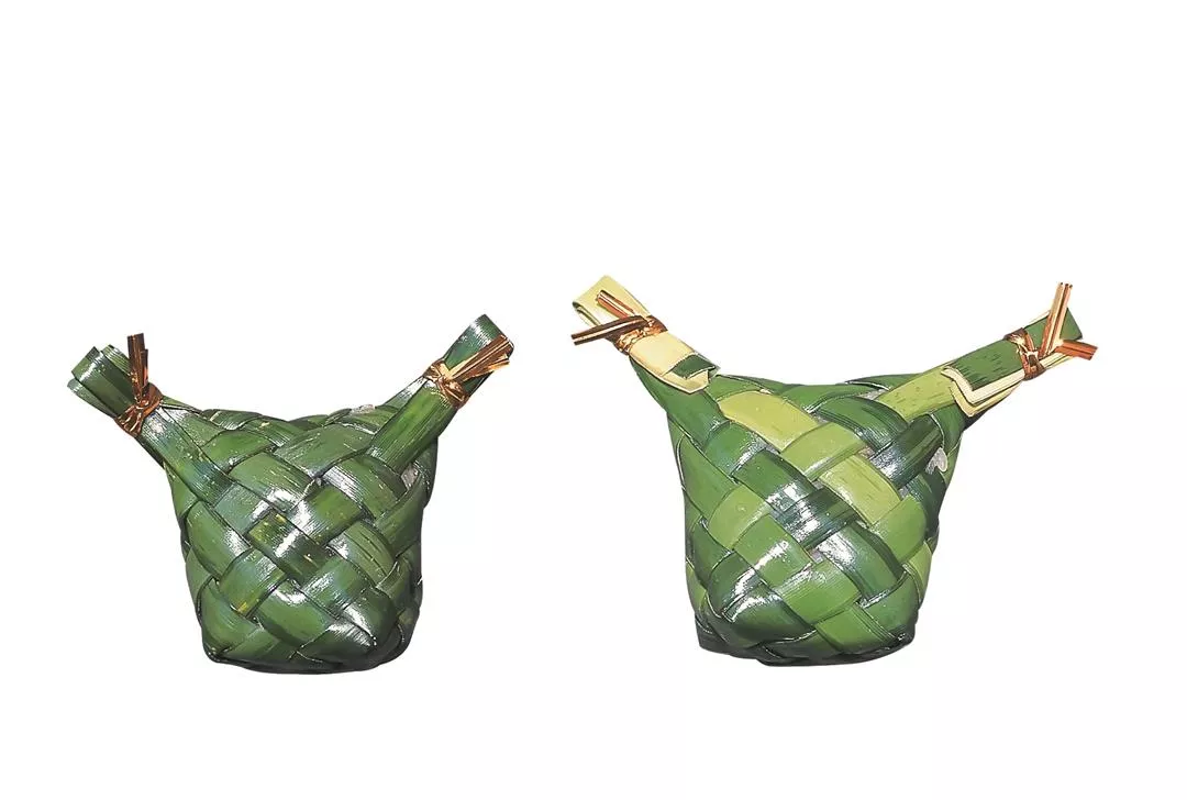 用林投葉編織成方形容器,加入米去蒸,即成阿里鳳鳳。