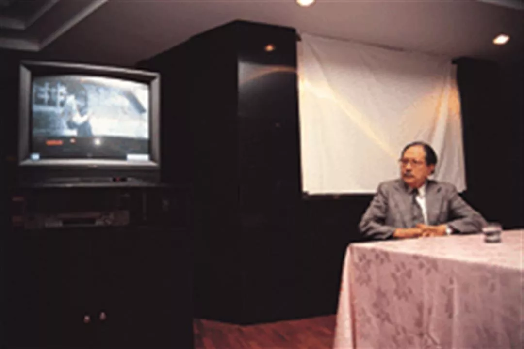 在金馬影展記者會上,辛奇觀賞自己以前執導的電影,一邊解說台語片的早期歷史。