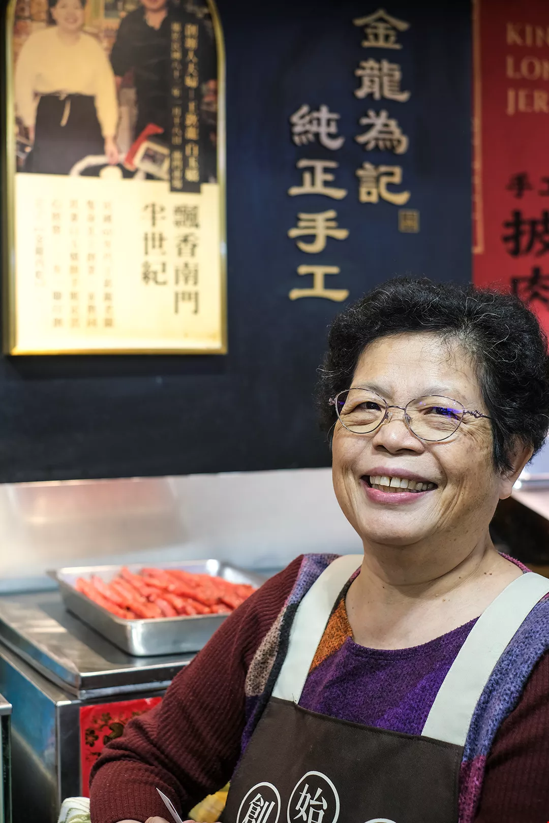 而1976年創立的「金龍肉乾」,則是老市場人情味的象徵。老闆娘白玉嬌分享,早年先生王欽龍在南門市場創業時,起初生意不見起色想要放棄,是王銓國爸爸那代的攤商們,鼓勵他繼續堅持。因為現炒肉鬆、現烤肉乾在當時很罕有,果然,最終熬出了頭,現在已有二代接手。