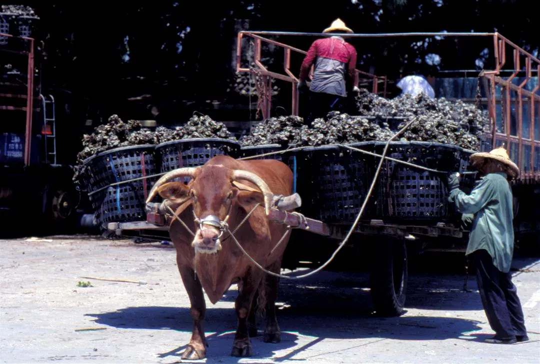 「主人改行,我也改行」。因為主人易農為養殖,老牛也改犁田為拖釣蚵。(鐘永和)