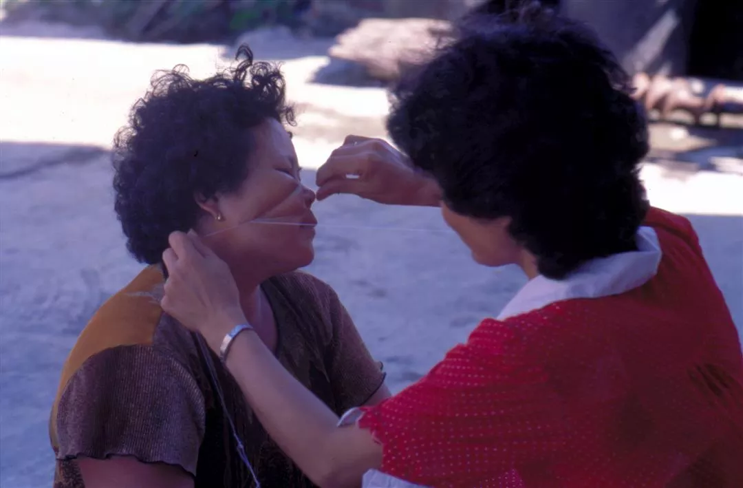 「挽面」是古時女人美容臉部的方法,如今在台西仍可見到。(鐘永和)