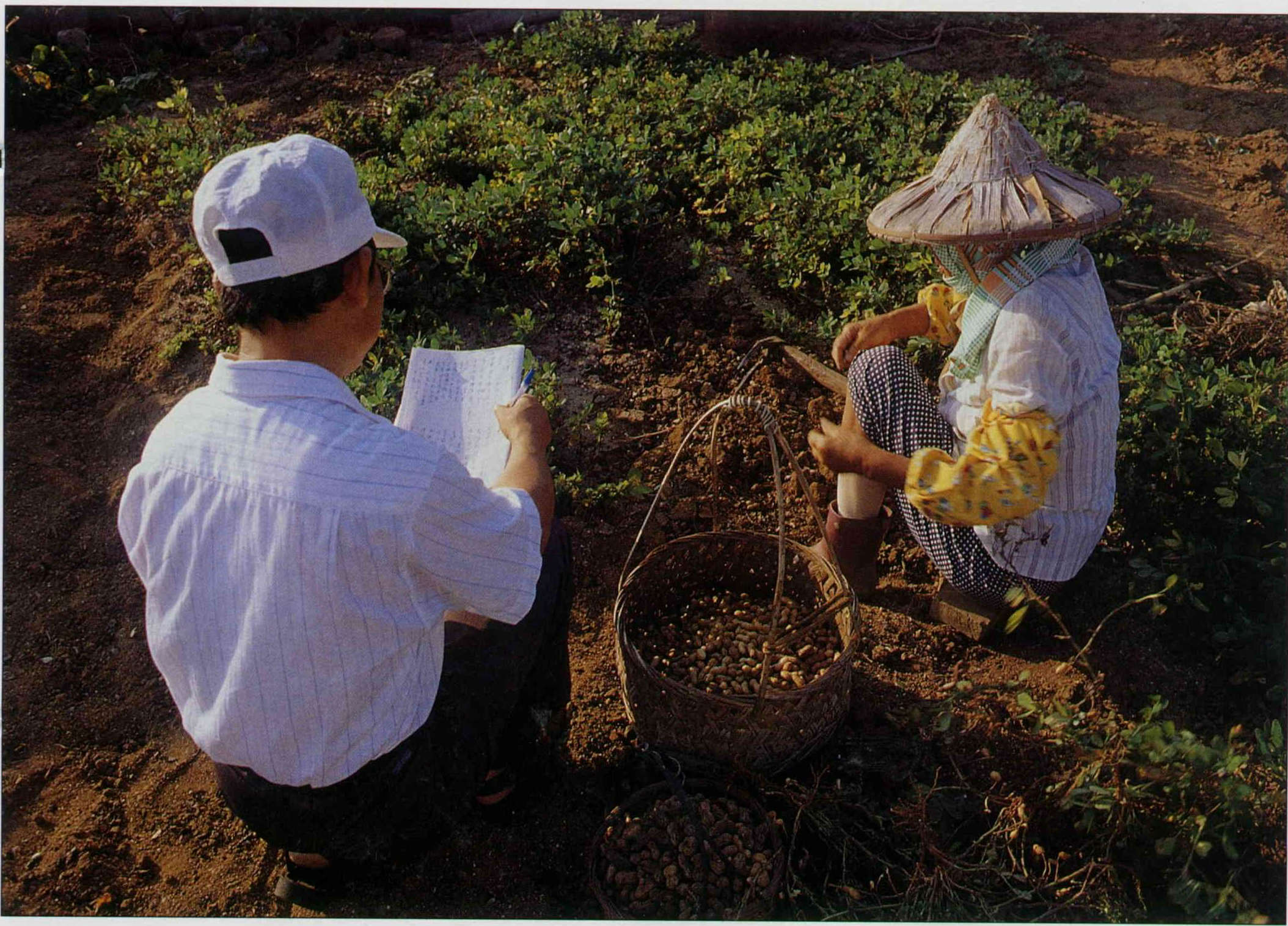 「選婆仔,來找你褒歌啦」,洪敏聰說明來意,就蹲下來幫忙「翻花生」——翻揀採收遺落的零散花生。「歌是腹裡褒,心肝不清怎麼褒?」夕陽金光照得阿婆直流眼油。洪敏聰聽了也就不再提褒歌,一邊幫忙一邊和阿婆聊這花生怎麼這麼多空心莢,高粱如何去殼,怎麼煮來吃。個把鐘頭過去,洪敏聰就著眼前花生順口褒起幾首有花生的歌。