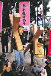 十年教改褒貶不一,千萬學子的學習壓力有增無減,「基層教師協會」及「快樂學習教改連線」代表以背負十字架,來表達沉重的抗議。