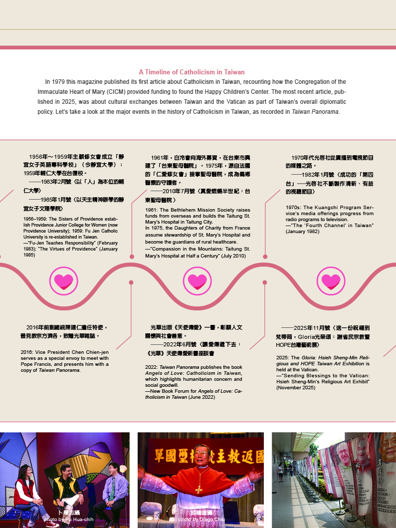 天使傳愛 天主教在台灣 文‧曾蘭淑 圖‧莊坤儒 2025 12月 EN 日本語 分享: . 關鍵字: 光華50 台灣天主教 天主教大事紀 傳教士與修女 屏東萬金天主堂 萬金聖母遊行 天主教堂建築 國際宗教交流 原住民部落文化 輔仁大學 歷史 宗教 新住民 教育 人物 建築 外交 分享: