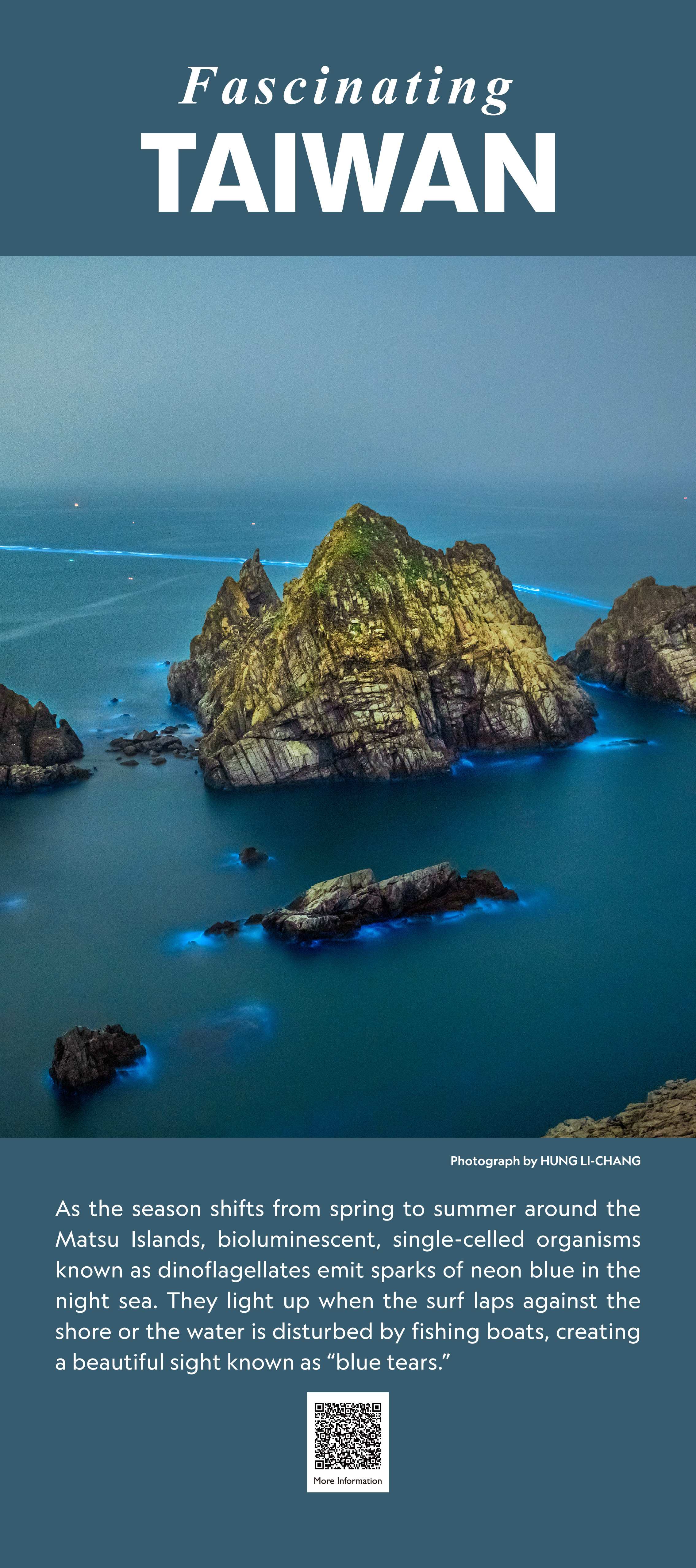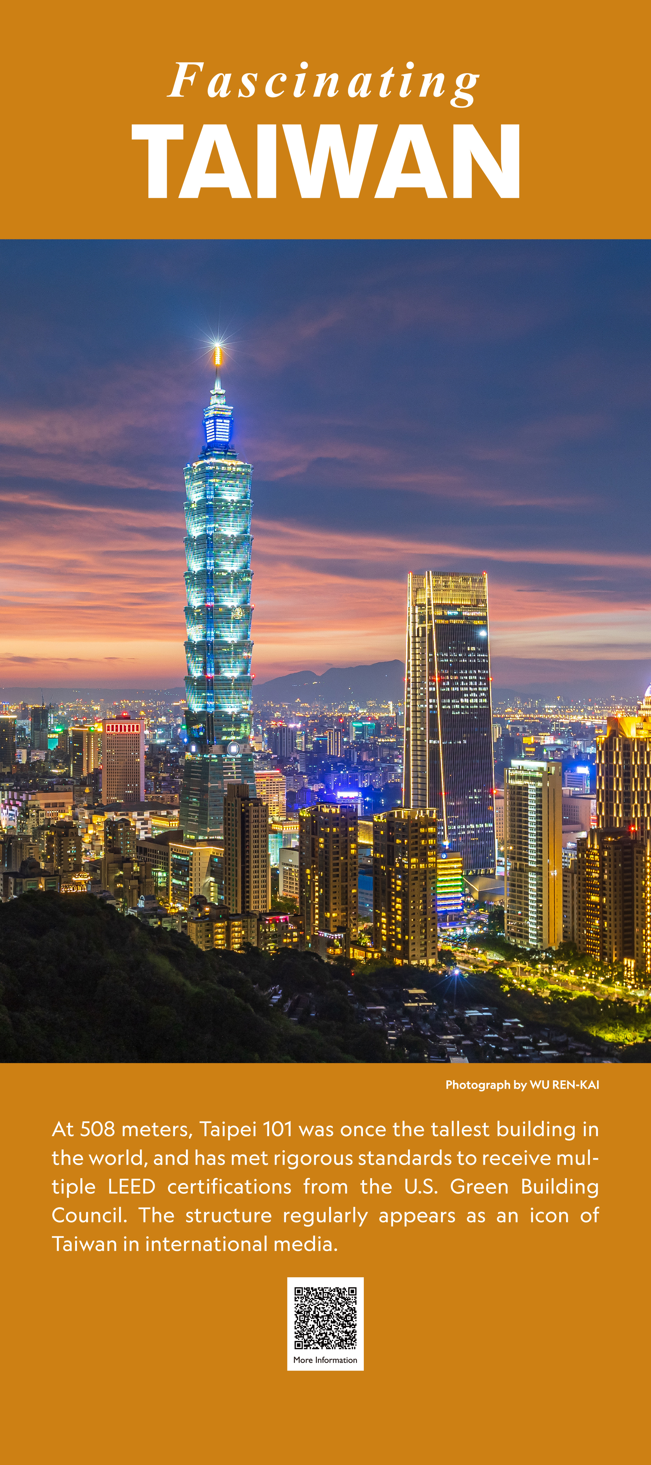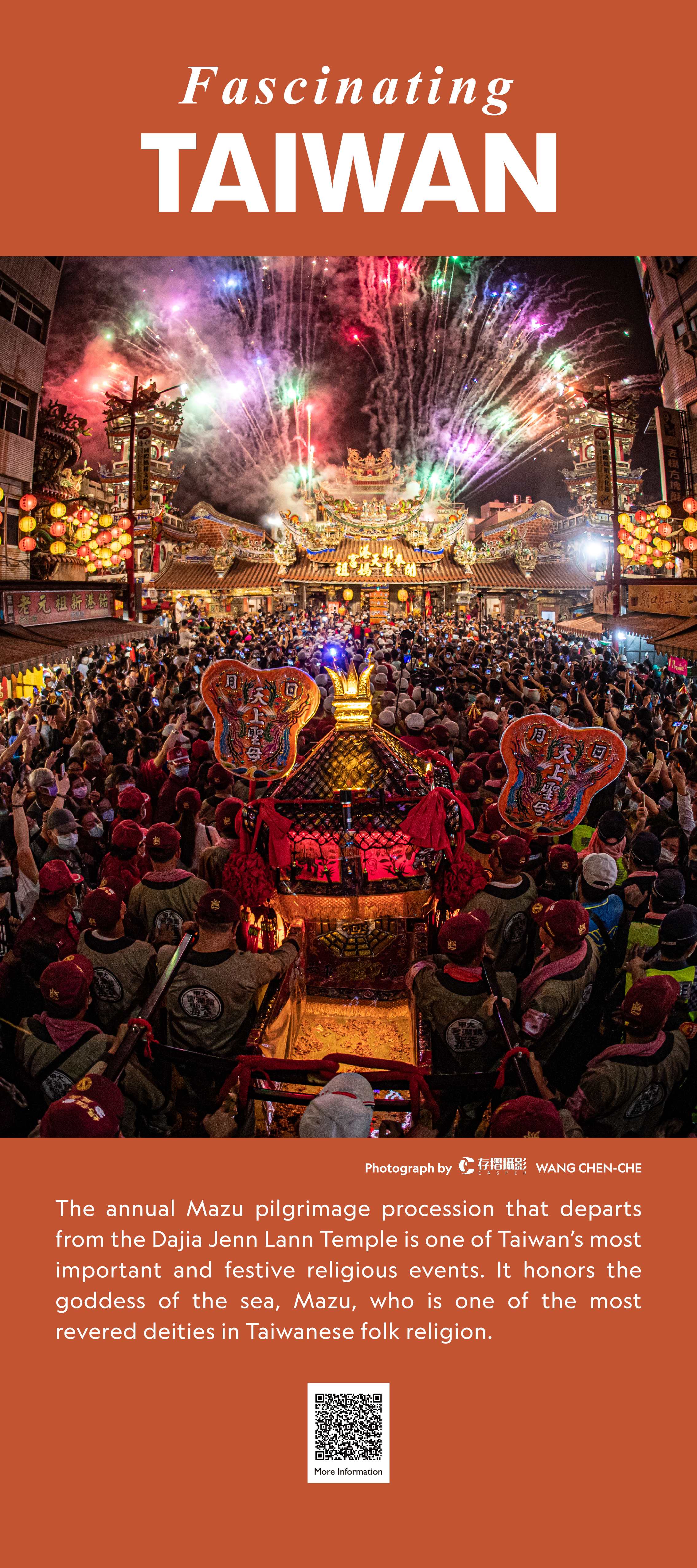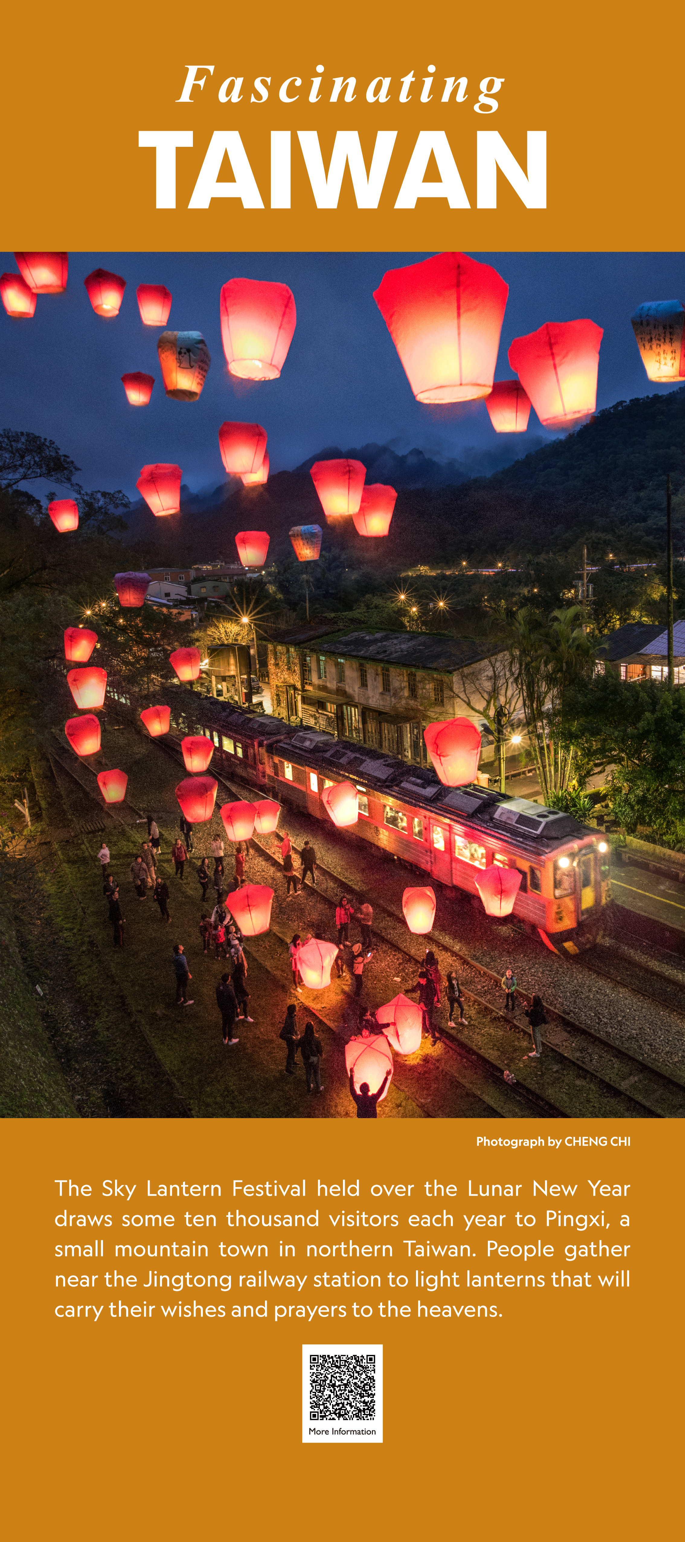 Fascinating TAIWAN 迷人台灣 2023 5月 EN 分享: 平溪天燈 農曆年期間,台灣北部山區小鎮平溪的天燈節,每年吸引上萬遊客造訪,點燃天燈許願、祈福。拍攝地點為菁桐車站。 拍攝者: 鄭淇 .台北101 樓高508公尺的台北101大樓曾經為世界最高建築,也多次獲得難度甚高的美國綠建築協會領先能源與環境設計(LEED)認證。台北101經常是國際媒體畫面上的台灣指標。 版權: 吳仁凱宜蘭冬山河 台灣東北部的冬山河在翡翠般碧綠的農田中蜿蜒入海,遠方的海面上可見龜山島。 拍攝者: 李乙謙台灣水鹿 這頭矗立在高山上的雄性水鹿是台灣的特有亞種。台灣的多樣地貌孕育了豐富的生物多樣性。 拍攝者: 段志豪雲門舞集 雲門舞集為台灣登上國際舞台之表演團體之一。這是一場在花東縱谷秋收時節以稻穗為舞台的演出。 拍攝者: 劉振祥辦桌•伴桌 「辦桌」是具台灣特色的飲食文化,符合了台灣人熱情、好客、大方的特性。一場完美的辦桌饗宴,除豐盛新鮮的食材外,「總鋪師」(主廚)更是重要的靈魂人物。 拍攝者: 張凱婷馬祖藍眼淚 每年春夏交替之時在馬祖島嶼海域,會發光的夜光蟲(渦鞭毛藻)受到海浪拍打岸礁或漁船航行的驚擾,綻放一陣陣藍色螢光,如真似幻般的美景,稱為「藍眼淚」。 拍攝者: 洪利昌媽祖遶境 【大甲媽遶境】是一張記錄媽祖遶境的攝影作品。媽祖是台灣民間信仰中,最具代表性的神祇之一。大甲鎮瀾宮媽祖遶境進香行程為台灣年度宗教盛事。 拍攝者: 王呈哲(存摺攝影)獵風者衛星 獵風者(Triton)衛星是台灣國家太空中心自行設計與製造的衛星,預計送上低地球軌道並運用在氣象研究。 版權: 國家太空中心晶圓 台灣在全球半導體產業鏈居關鍵及領先地位,全球尖端晶片製造有90%產能集中在台灣。 拍攝者: LAWRENCE MANNING (GETTY IMAGES) 觀光 攝影 國家 島嶼 休閒 海洋 生態保育 地方 分享:
