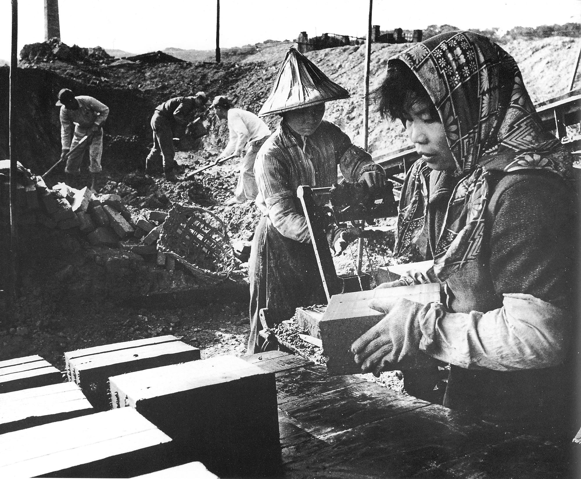 女工們排成一排,鐮子此起彼落,叭喳!叭喳!菅草成把地向一邊倒來,她們的衣著可用兩色分開;清藍和赤銅色:笠上一律包著藍洋布,手足都有一排爪子形的黃鈕扣的黑裹腿,手套和膠底鞋武裝起來。燕妹包好頭巾,又插進橫隊的第四位上去了。