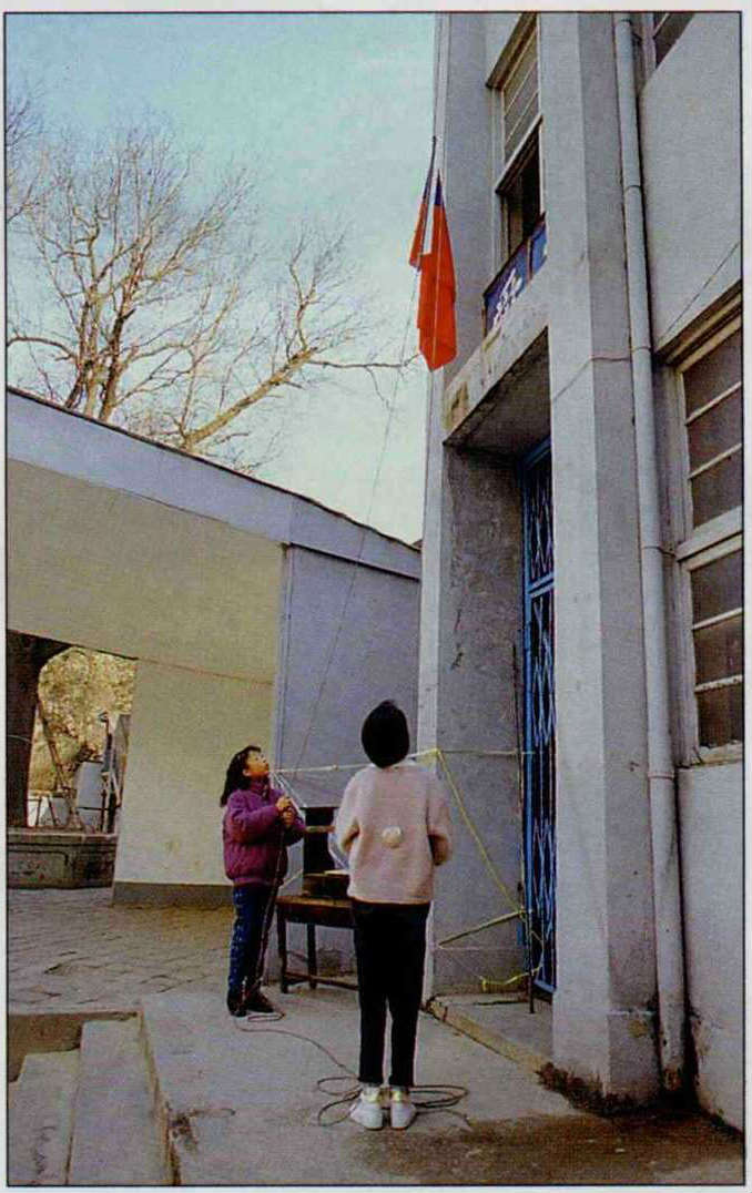 學校開學了,經過幾番喧擾,孩子們依舊在自然課中分辨國旗上有幾個三角形、四方形;在數學課上計算著三面國旗有幾種顏色;美術課給國旗著色;音樂課教唱國歌……。教室外,飄起雪來,工友們笑著說,「你瞧,隔壁大使館那隻大狗,還是跑來咱們學校上課了!」