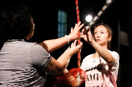 台灣第一位太陽馬戲團團員楊舒晴,在以外國觀光客為主要觀眾的「台北戲棚」常有演出,她每天也都找時間在此練功。