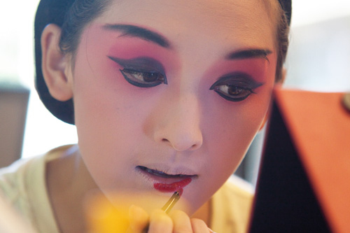 柳葉眉、杏花眼,年輕的京劇演員扮起戲來,完全是一個中國古典美女的形象。