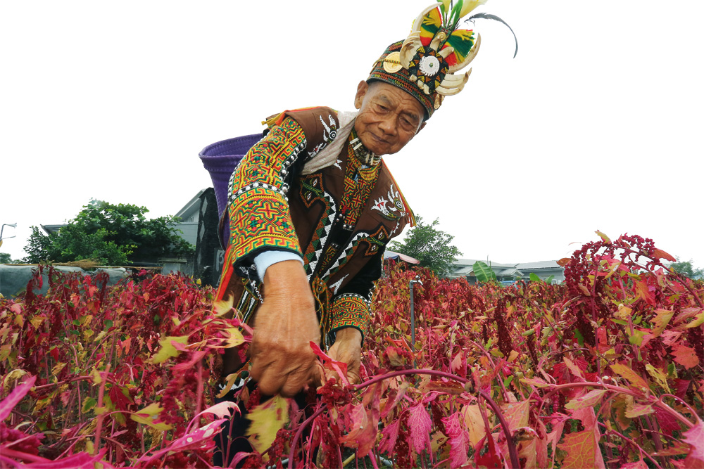 常見於原住民部落的台灣藜,八八風災後成為不少部落振興在地產業的重要作物。圖為阿禮部落原住民巴清一正在採收紅藜。