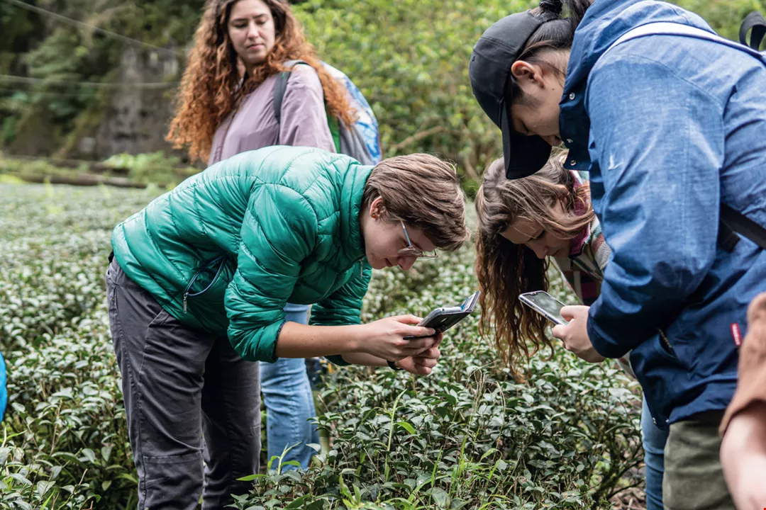 台大為Minerva Schools舉辦的工作坊 「從土地到手裡的台灣茶」,帶領學生到 坪林茶園觀察。(台灣大學國際事務處提供)