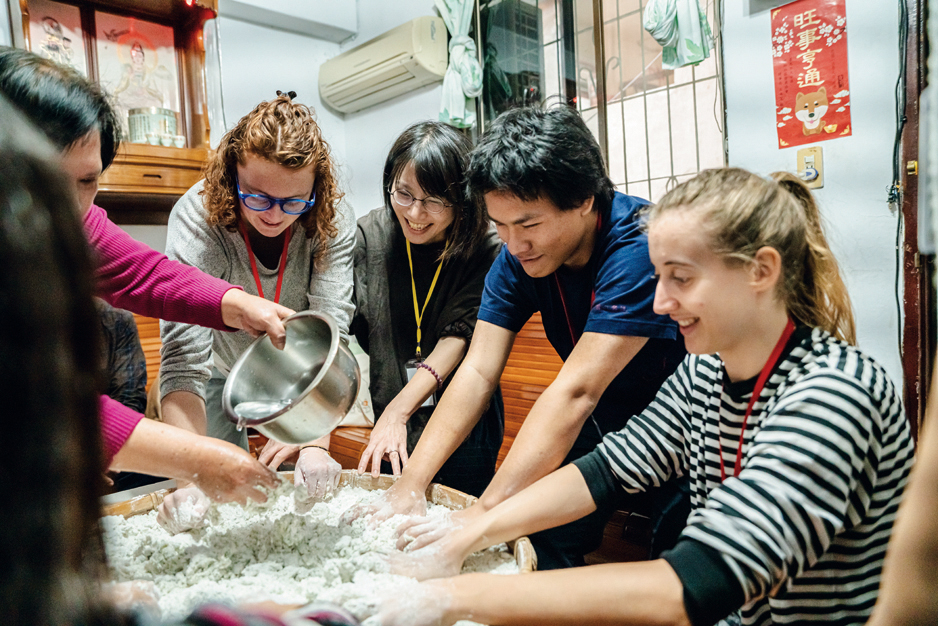 這天,在台北公館旁的蟾蜍山聚落,有兩戶人家特別熱鬧。來自不同國家的年輕人捲起袖子,將手伸進大竹篩,在「葉媽」的指令下,搓揉著糯米粉。揉啊揉,原本生疏的一群人,臉上逐漸展開笑靨。而另一戶的廚房裡,年輕人站在爐火旁,圍繞著正在切菜的「阿美姐」,問起她與這道料理的緣分。